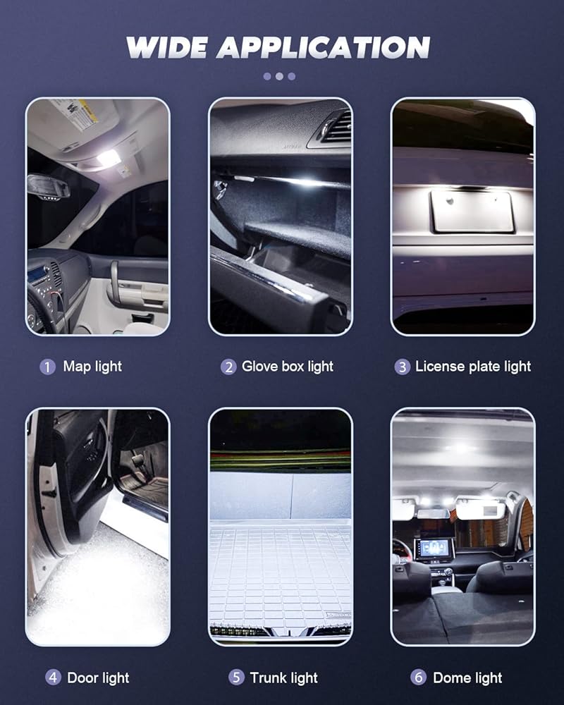 تطبيقات واسعة: يمكن استخدام لمبة LED 194 لإضاءة القبة، وإضاءة الخريطة، وإضاءة لوحة الترخيص، وأضواء لوحة أجهزة القياس، وإضاءة الباب الداخلي، وإضاءة التحديد الجانبية، وإضاءة صينية الرماد، وإضاءة صندوق القفازات، وإضاءة محرك الفحص، وإضاءة إيقاف التثبيت المرتفعة في المنتصف وما إلى ذلك وهلم جرا