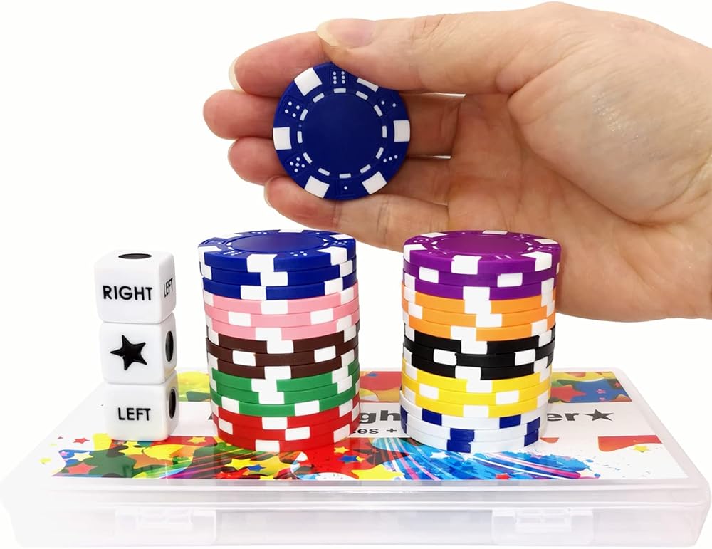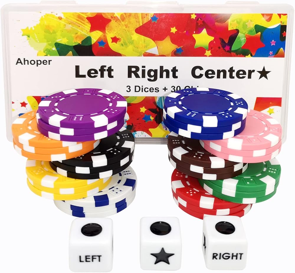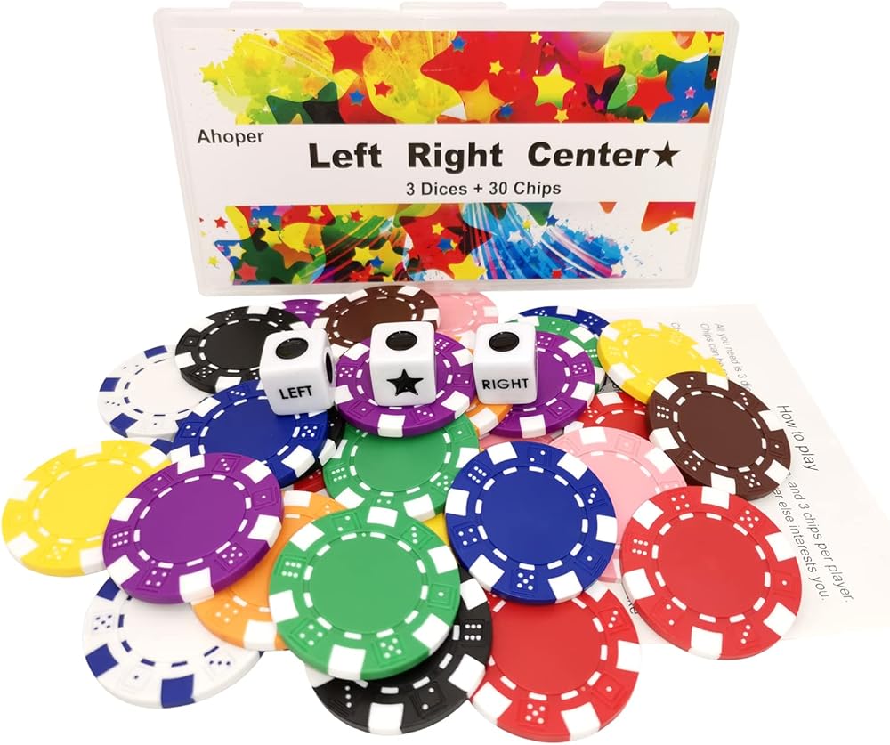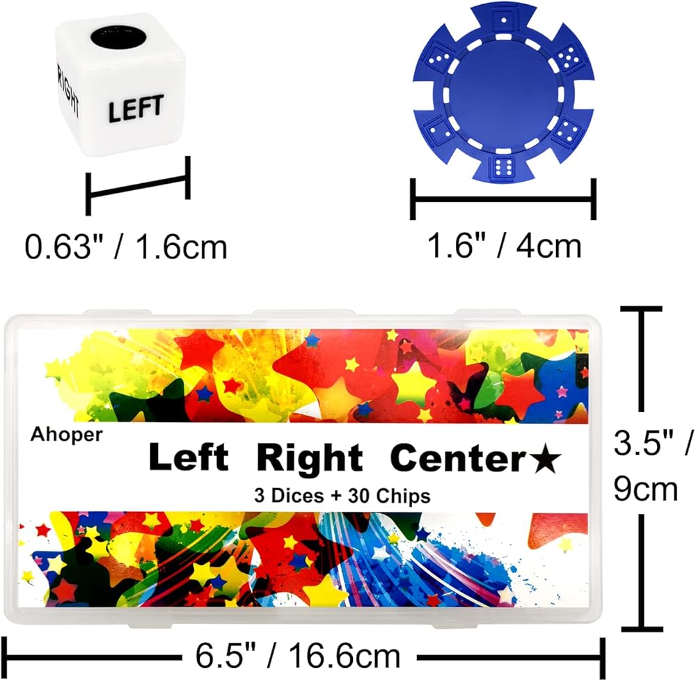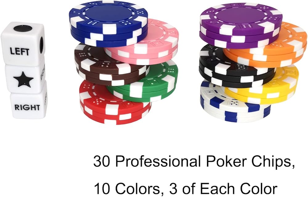 مجموعة ألعاب النرد المركزية اليمنى واليسرى مع 3 نردات + 30 شريحة بوكر احترافية كبيرة، ورقائق كازينو 11.5 جرام.
