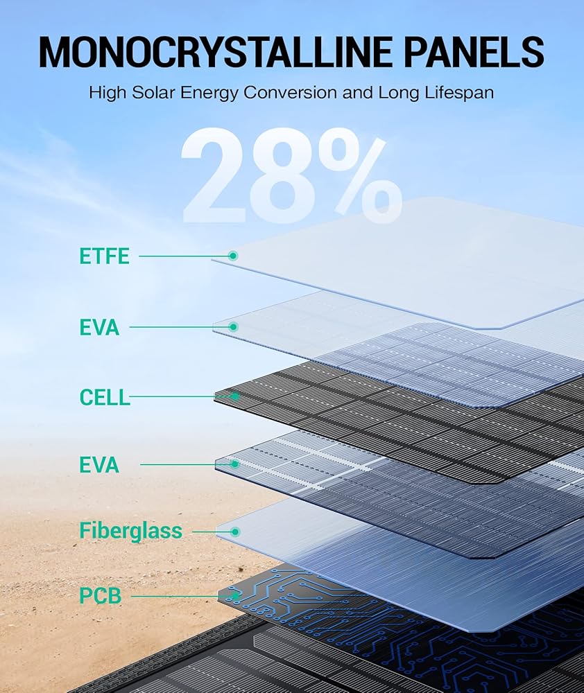 معدل تحويل عالي الكفاءة: تعمل الألواح الشمسية عالية الكفاءة على تحويل 28% من الطاقة الشمسية إلى طاقة مجانية في ضوء الشمس الكافي، كما أن ألواح السيليكون الأحادية البلورية الأكثر متانة، والتي تتحمل التآكل بشكل أفضل من الألواح التقليدية، توفر أعلى كفاءة في تحويل الطاقة.