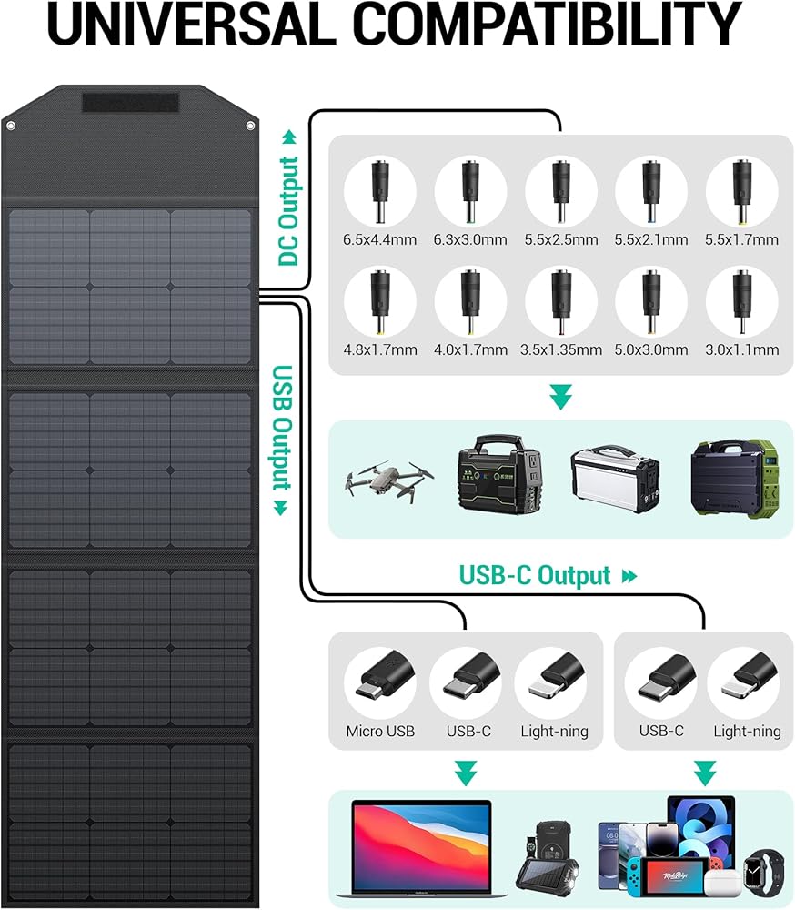 مثالية للأنشطة الخارجية: تصميم بفتحتين للتعليق، ويمكن تعليقها بسهولة على سطح السيارة أو الخيمة باستخدام الحلقات المتضمنة. يمكن طي اللوحة الشمسية كحقيبة لسهولة الحمل، وهي مثالية للسفر أو التخييم أو صيد الأسماك أو المشي لمسافات طويلة حتى لا ينفد جهازك أبدًا من الطاقة في الشمس الكاملة.