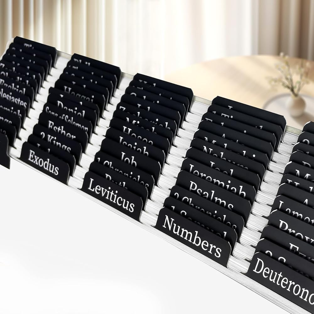 للعهد القديم والجديد: توجد 100 علامة تبويب لمؤشر الكتاب المقدس في هذه المجموعة، و66 علامة تبويب للعهد القديم والجديد، و7 للكتب الكاثوليكية، و8 للرجوع إليها و19 علامة فارغة بتصميم فريد يمكن تخصيصه أو استخدامه لفهرسة الكتب الأخرى.