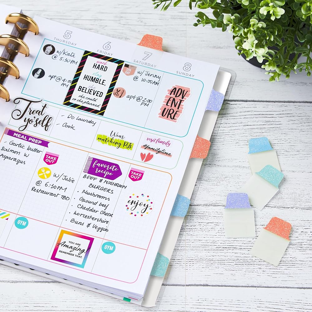 Premium pastel purple, green, blue and orange note tabs coated with gold glitter add a sparkling shimmer to bullet journals and planners