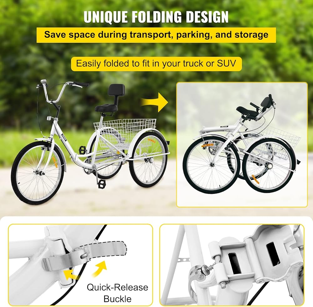 تصميم فريد قابل للطي: الحجم المطوي (الطول × العرض × الارتفاع): 50 بوصة × 38.6 بوصة × 42.1 بوصة/127 × 98 × 107 سم. بفضل الإبزيم سريع التحرير، يمكن طي دراجتنا ثلاثية العجلات للبالغين بسهولة إلى النصف. يتيح التصميم سهولة النقل والتخزين الموفر للمساحة ومواقف مريحة للسيارات.عند طيها، ستتناسب الدراجة ذات الثلاث عجلات للبالغين بشكل مثالي مع شاحنتك أو سيارات الدفع الرباعي.