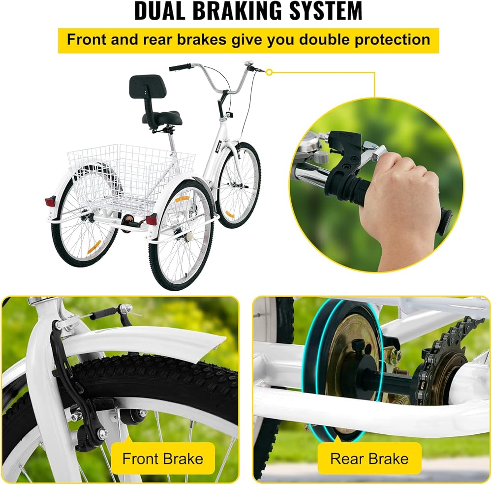 نظام الكبح المزدوج: تم تجهيز الدراجة ثلاثية العجلات القابلة للطي بمكابح أمامية وخلفية لتوفير حماية مزدوجة. يضمن نظام الكبح المزدوج الأمان وقوة التوقف القوية حتى عند القيادة على المنحدرات. يمكنك البدء بسرعة في الكبح بالضغط على المقبضين، مما يؤدي بشكل ممتاز في حالات الكبح الطارئة أثناء الركوب.