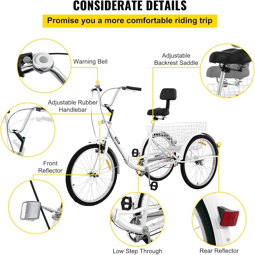 صُنعت خصيصًا لك: كل تفاصيل هذه الدراجة ذات الثلاث عجلات موجهة نحو راحتك وراحتك. يمكن تعديل ارتفاع المقاود المطاطية والسرج المبطن الناعم مع مسند الظهر للترحيب بالركاب من جميع الأحجام. الخطوة المنخفضة تجعل من السهل ركوب الدراجة ثلاثية العجلات. تضمن العاكسات والجرس أمانك أثناء الركوب ليلاً.