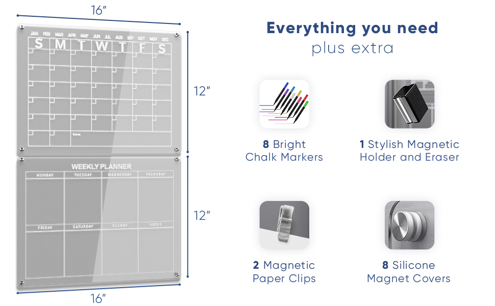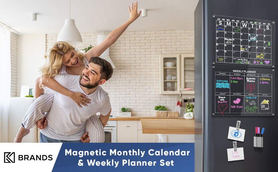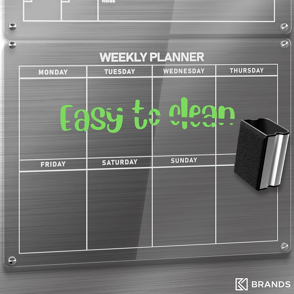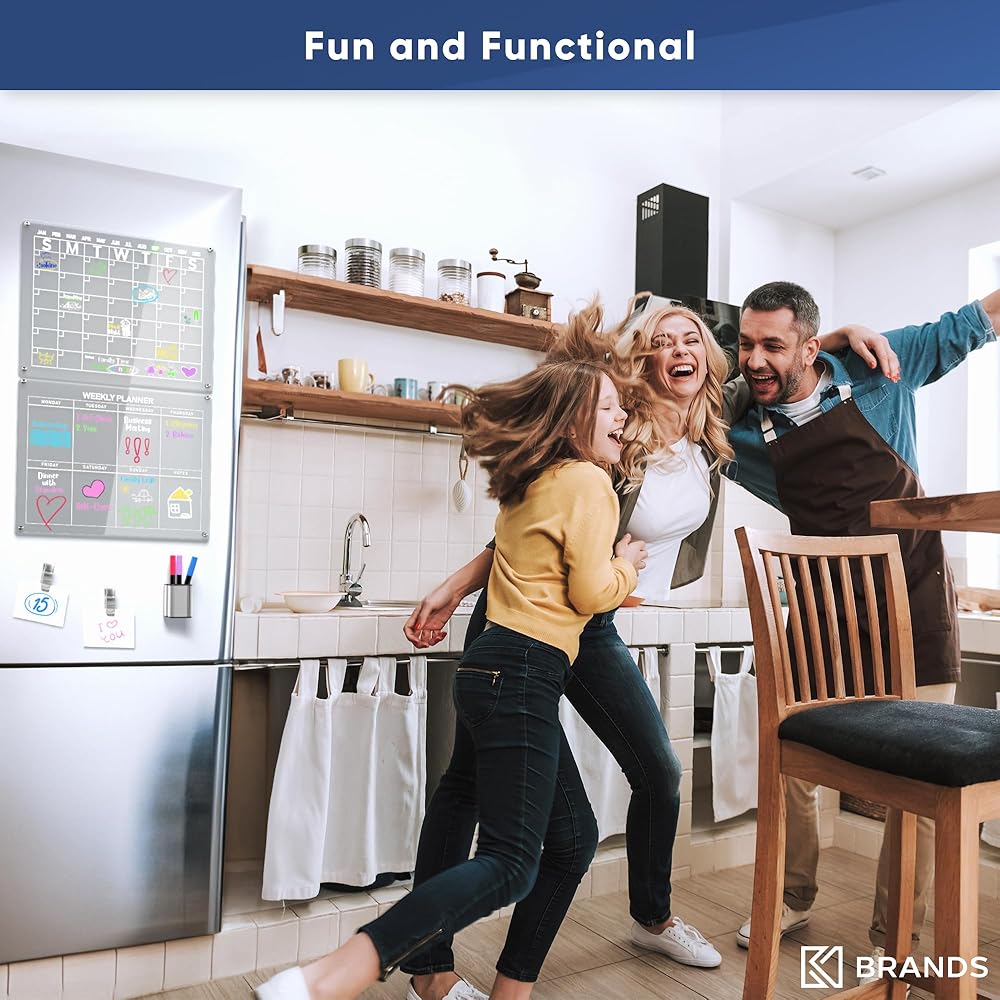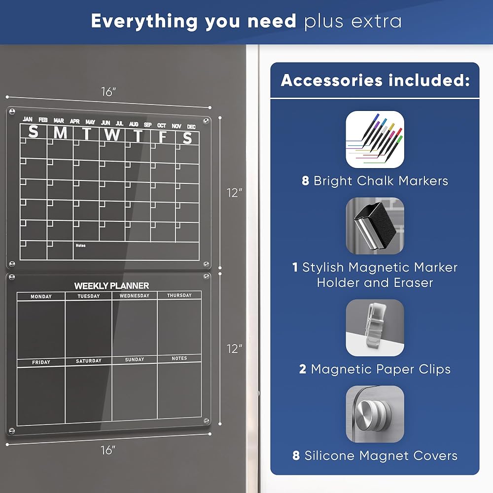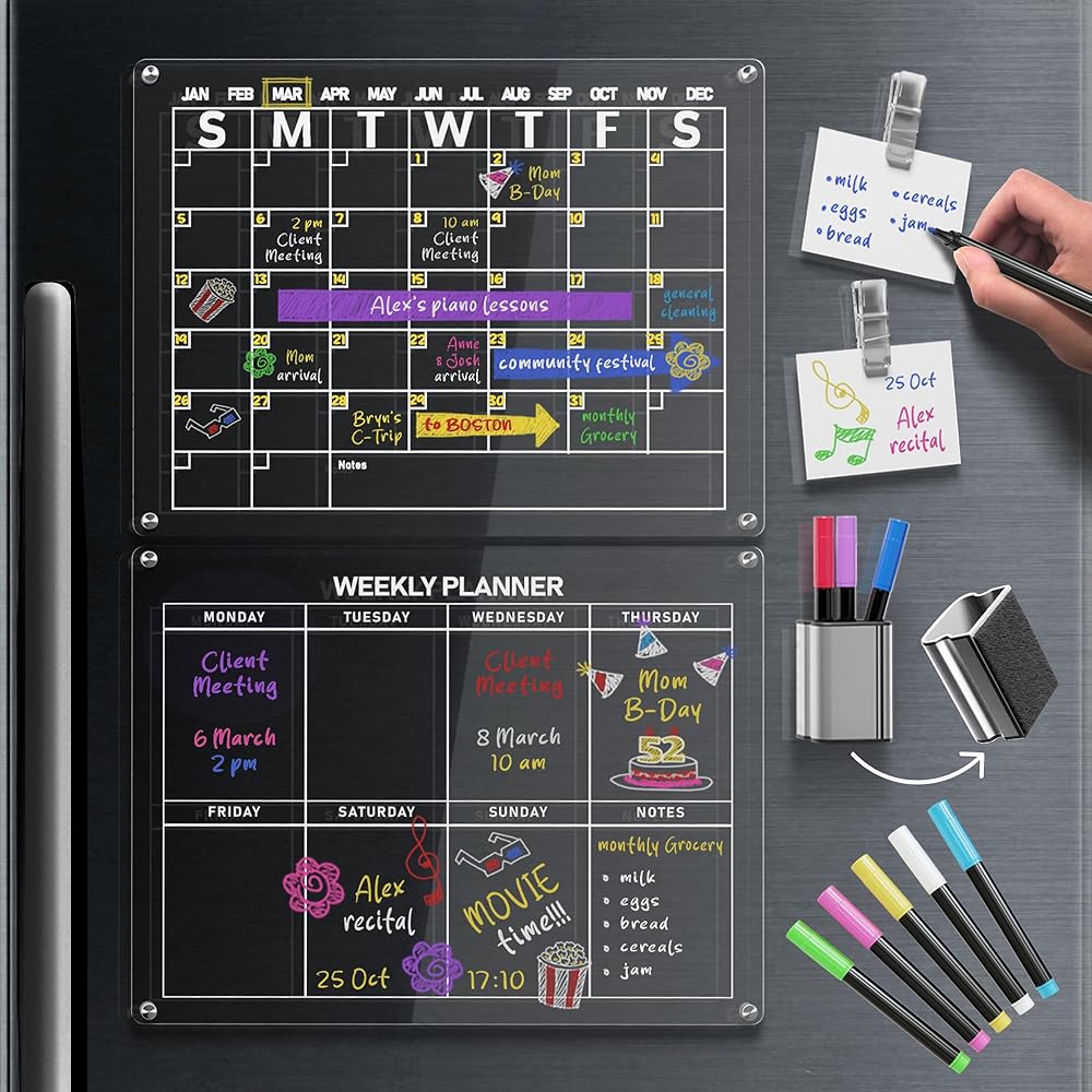 🗓️ مجموعة التقويم الشهري المغناطيسي والمخطط الأسبوعي: حافظ على تنظيم عائلتك من خلال تقويم الثلاجة الأكريليكي متعدد الاستخدامات، والذي يتميز بمناظر شهرية وأسبوعية.