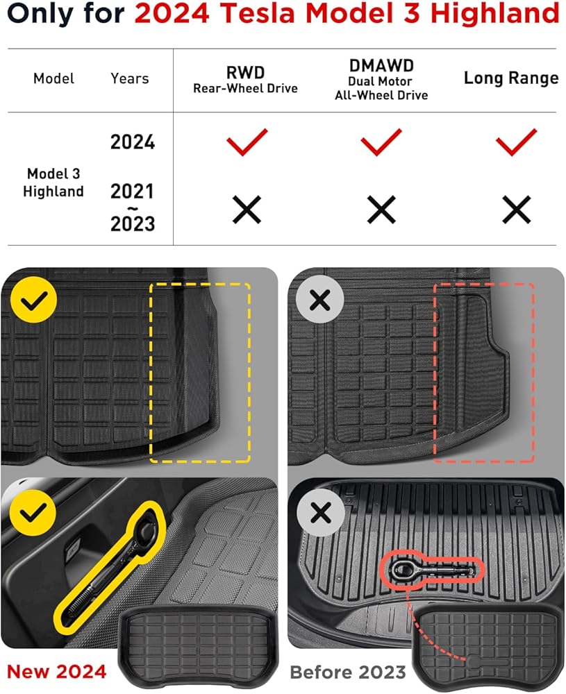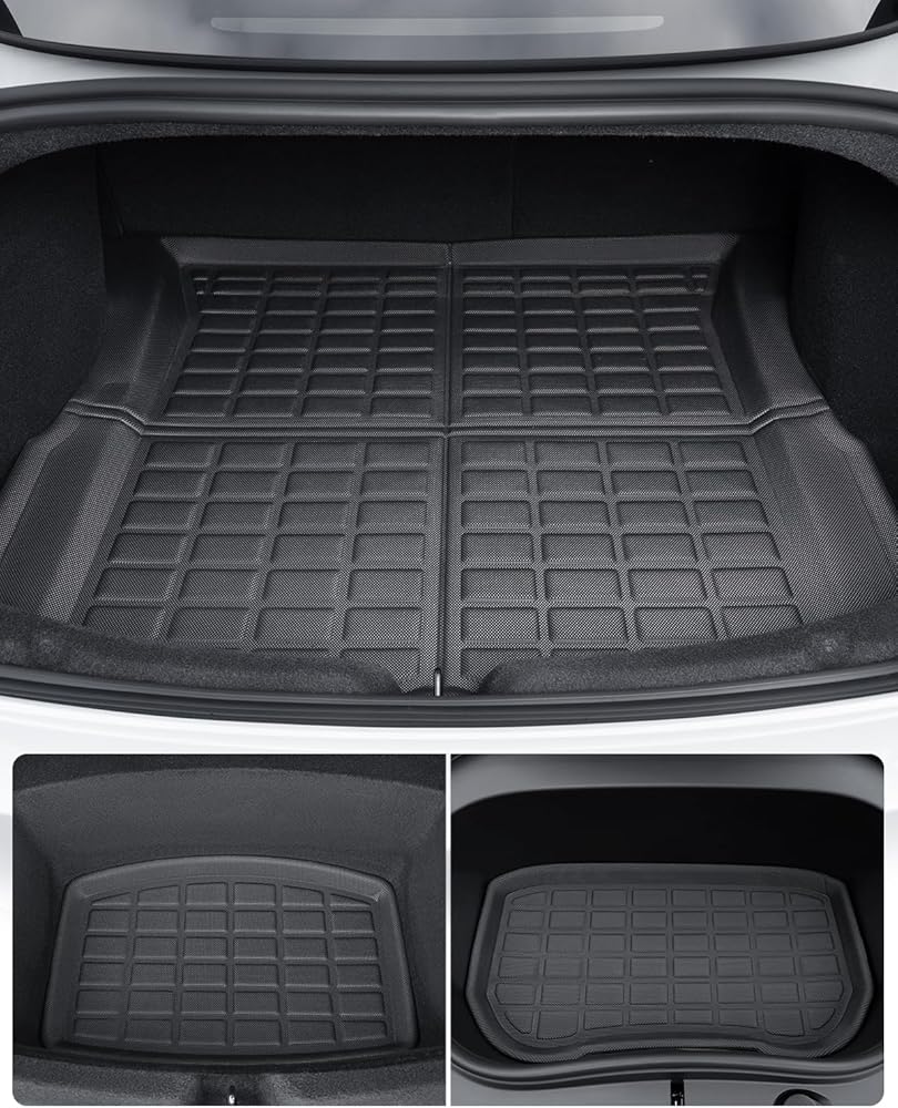 TAPTES 2024 Tesla Model 3 سجادات أرضية المرتفعات، مجموعة كاملة من Tesla Model 3 بطانات أرضية لجميع الأحوال الجوية 2024، Tesla Model 3 2024 Highland Accessories Tesla 3 Trunk Frunk Mat Rear علبة البضائع الداخلية (6 قطع)