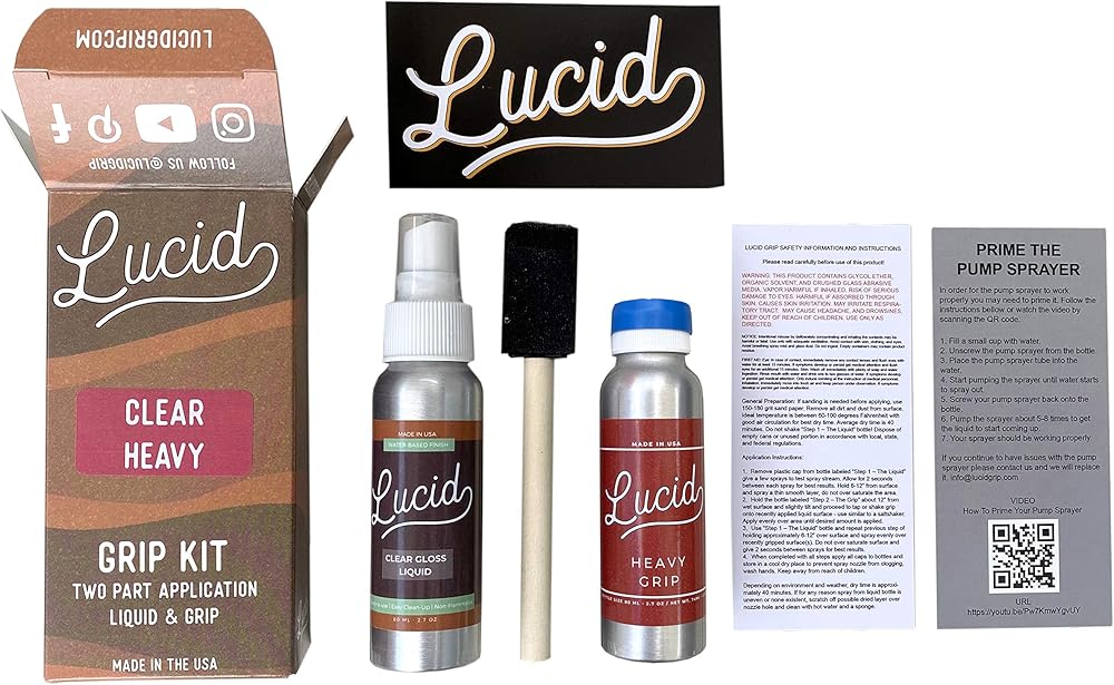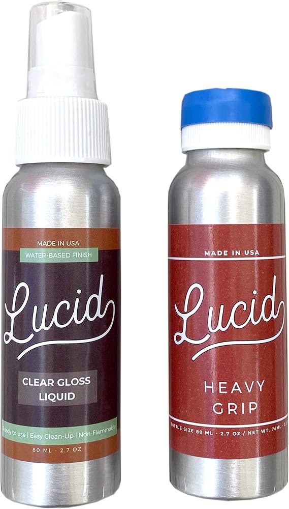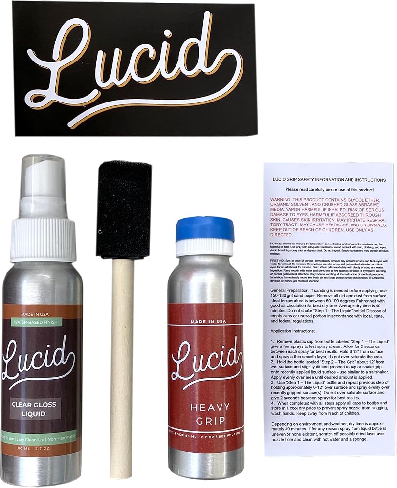 Lucid's Clear LiquidOur grip tape is a water-based, hard acrylic emulsion polymer that exhibits excellent stain and water-resistant properties. Our water based premium grade, non-yellowing, clear acrylic top coat is suitable for almost all finished surfaces.