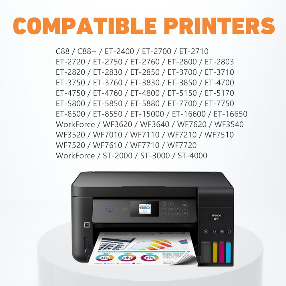 • الطابعات المتوافقة: تستخدم لـ ET-3760 ET-4800 ET-4700 ET-3830 ET-3850 ET-2720 ET-2760 ET-2800 ET-2803 ET-2830 ET-2850 ET-2710 ET-3710 ET-4760 ET-8550 WF-3620 WF-3640 WF-7620 WF-3540 WF-3520 ET-15000 ET-16600 ET-16650 WF-7210 WF-7510 WF-7520 WF-7610 WF-7710 WF-7720 ستايلس C88 C88+ طابعات