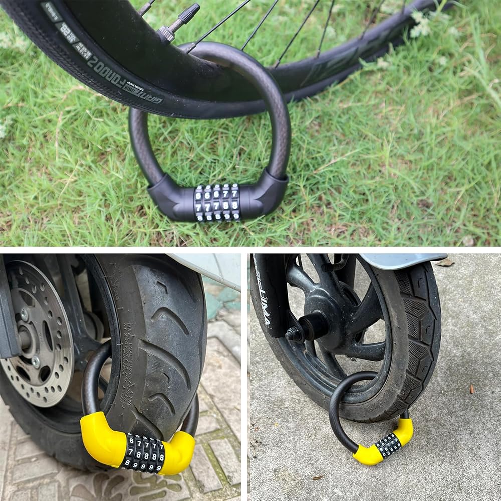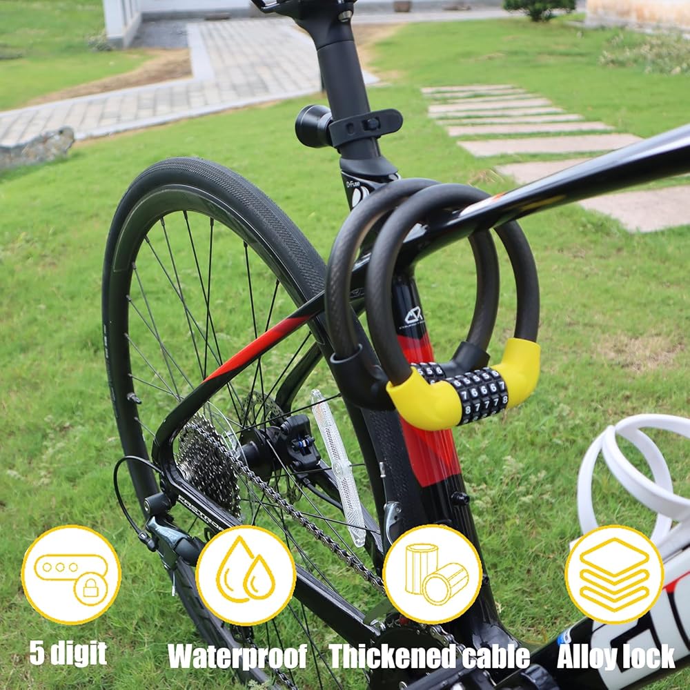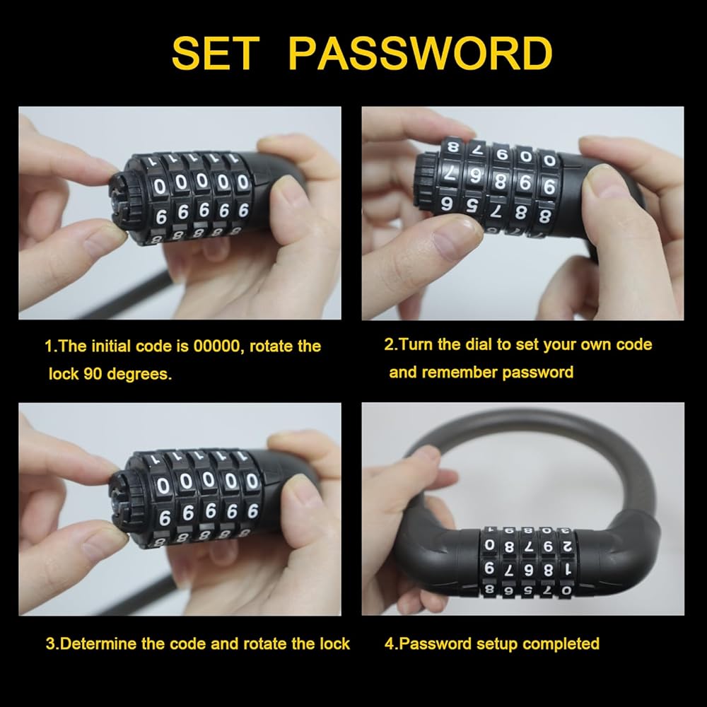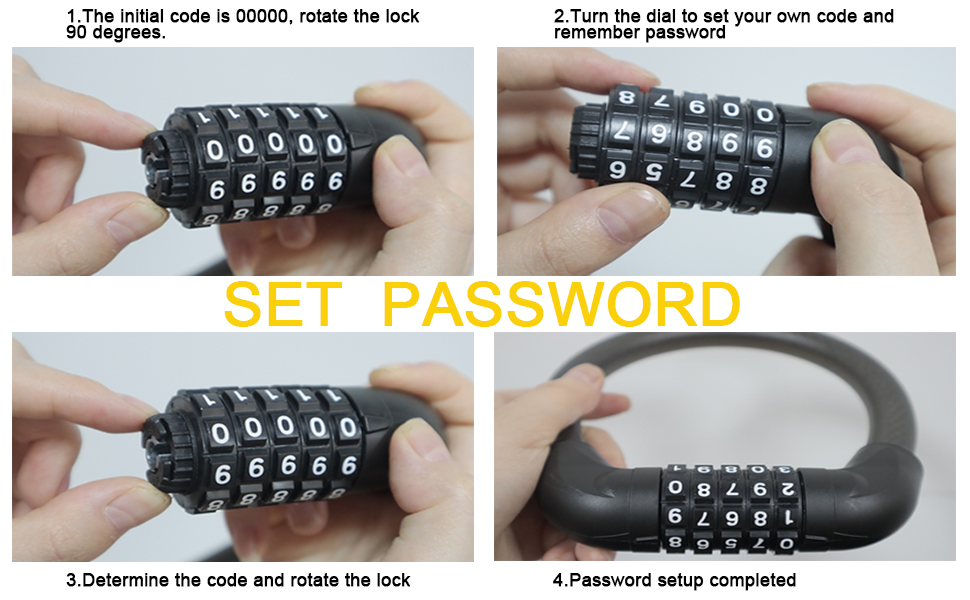 5 أرقام. يستخدم قفل كابل الدراجة كلمة مرور مكونة من 5 أرقام يمكن دمجها في 100000 نوع من مجموعات الرموز. تلعب مجموعة متنوعة من مجموعات كلمات المرور تأثيرًا جيدًا ضد السرقة. الرمز سهل الاستخدام دون القلق بشأن فقدان/وضع المفتاح في غير مكانه (كلمة المرور الأولية 00000)