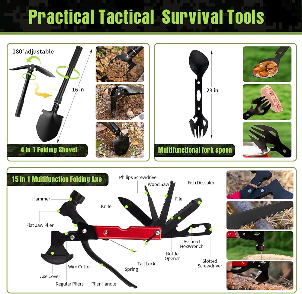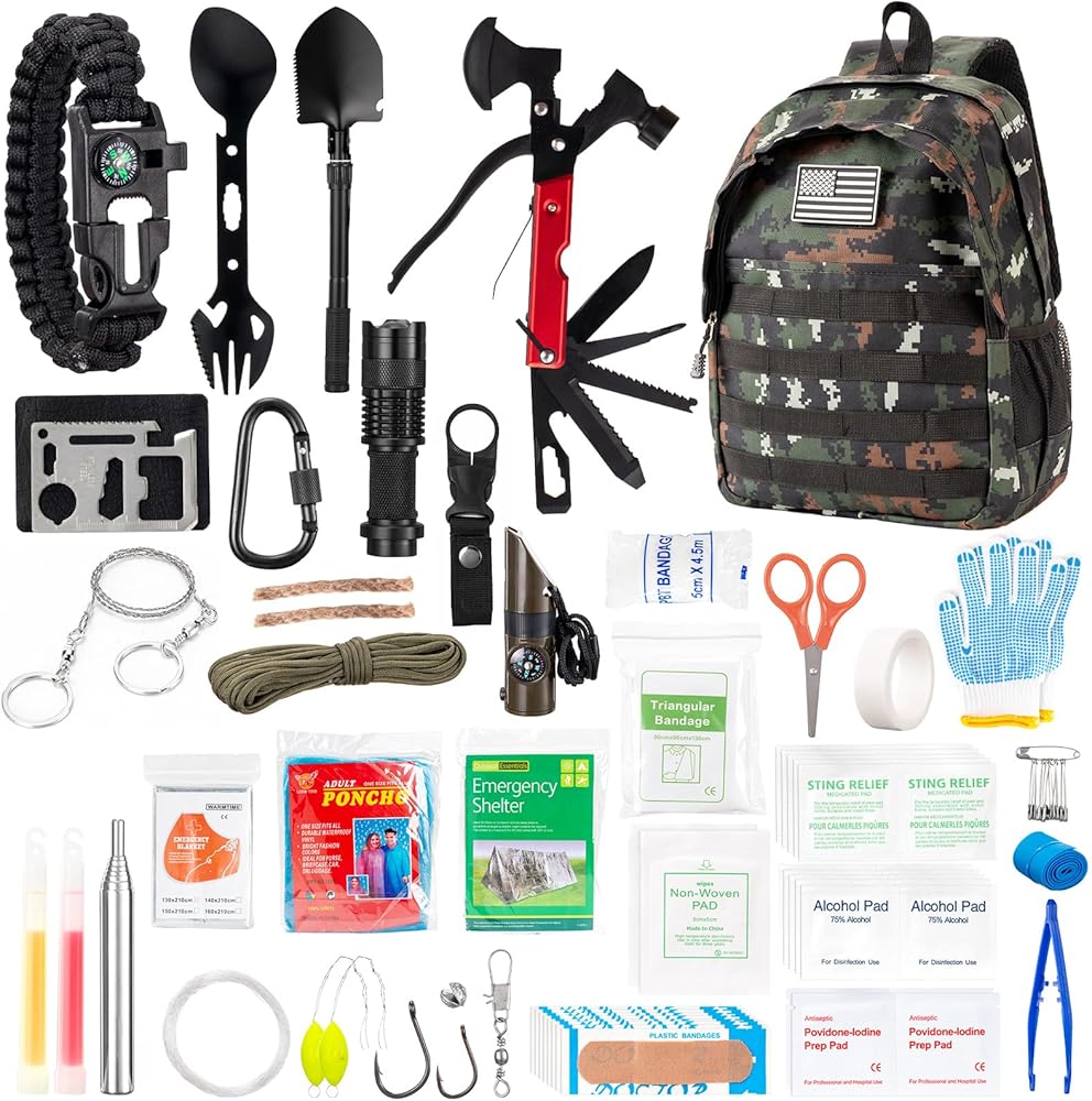 Introducing the ultimate Camping Survival Kit, a comprehensive 318-piece set packed with high-quality gear and emergency supplies to keep you prepared for any outdoor adventure or emergency situation. This survival kit is a must-have for camping enthusiasts, outdoor enthusiasts, and doomsday preppers alike. Featuring a wide range of tactical gear including a hatchet and flashlight, this survival kit has everything you need from military-grade equipment to essential first aid items. The portable Molle bag ensures easy transport and organization, making it perfect for various outdoor activities such as hiking, camping, hunting, and more. The Camping Survival Kit is designed for disaster preparedness and emergency situations, making it an essential addition to your gear collection. Whether you're exploring the great outdoors or preparing for the unexpected, this kit has you covered with supplies like a flare gun, tactical knife set, and emergency car survival kit. Don't wait until it's too late - equip yourself with the Camping Survival Kit today and be ready for whatever comes your way. This kit also makes a great gift for men who love outdoor adventures and are always seeking new challenges. Get your hands on this all-encompassing survival kit and ensure you're prepared for anything that comes your way.
