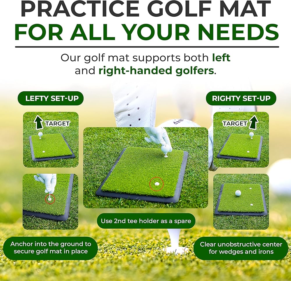 TWOFER - حوامل تي شيرت مزدوجة لليمين أو اليسار أو للاستخدام كاحتياطي. وسادة جولف محمولة للفناء الخلفي. مرساة للمكواة - استخدم حاملات المحملات المزدوجة لتثبيت سجادة الجولف هذه في مكانها باستخدام المحملات الطويلة.