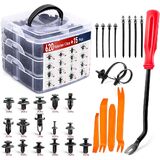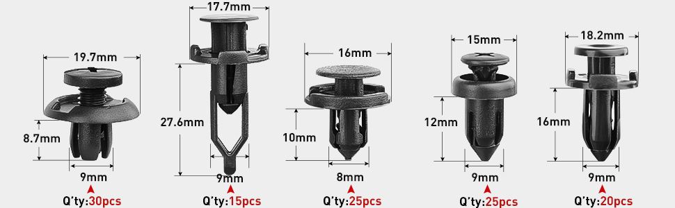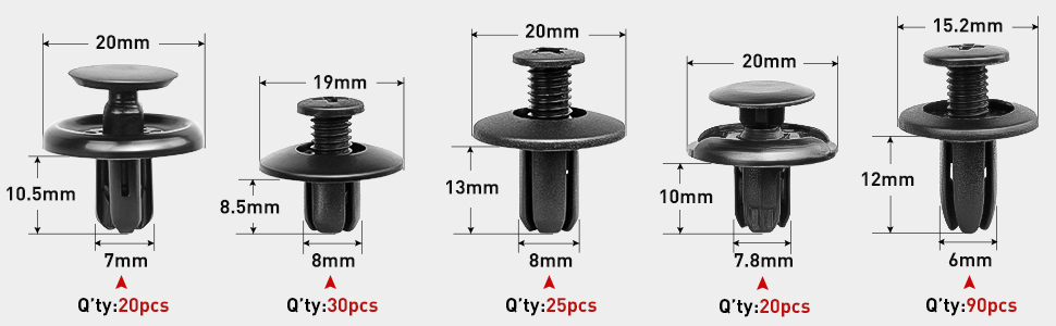 UNIVERSAL FIT KIT: - Great assortment push retainer kit with 16 most popular size, fitting for door trim, radiator shield yoke, fender, bumper, side skirt, grille, engine cover and splash shield retainers replacement,compatible with Ford, GM, Chrysler, Toyota, Honda and more. All packed in a plastic container for easy organization and storage.