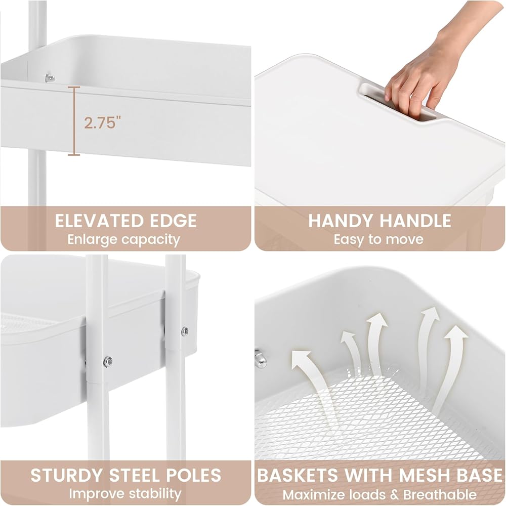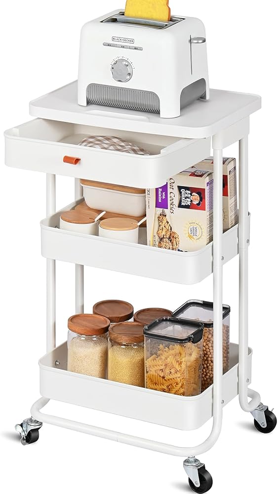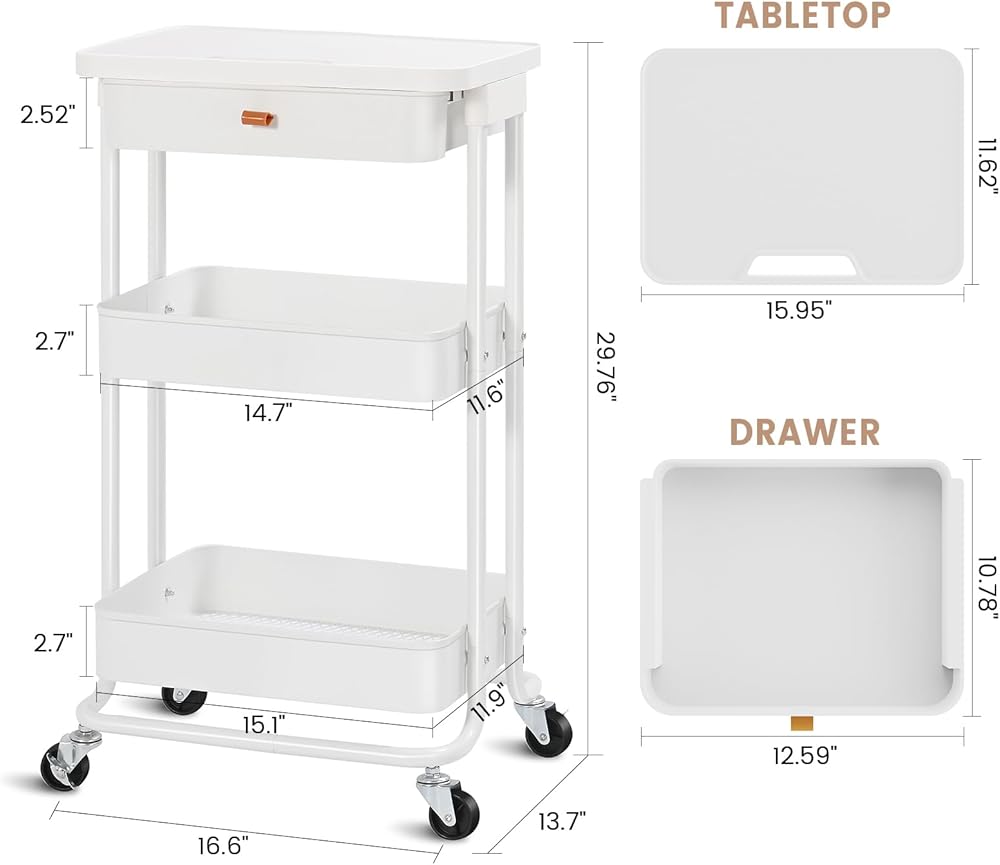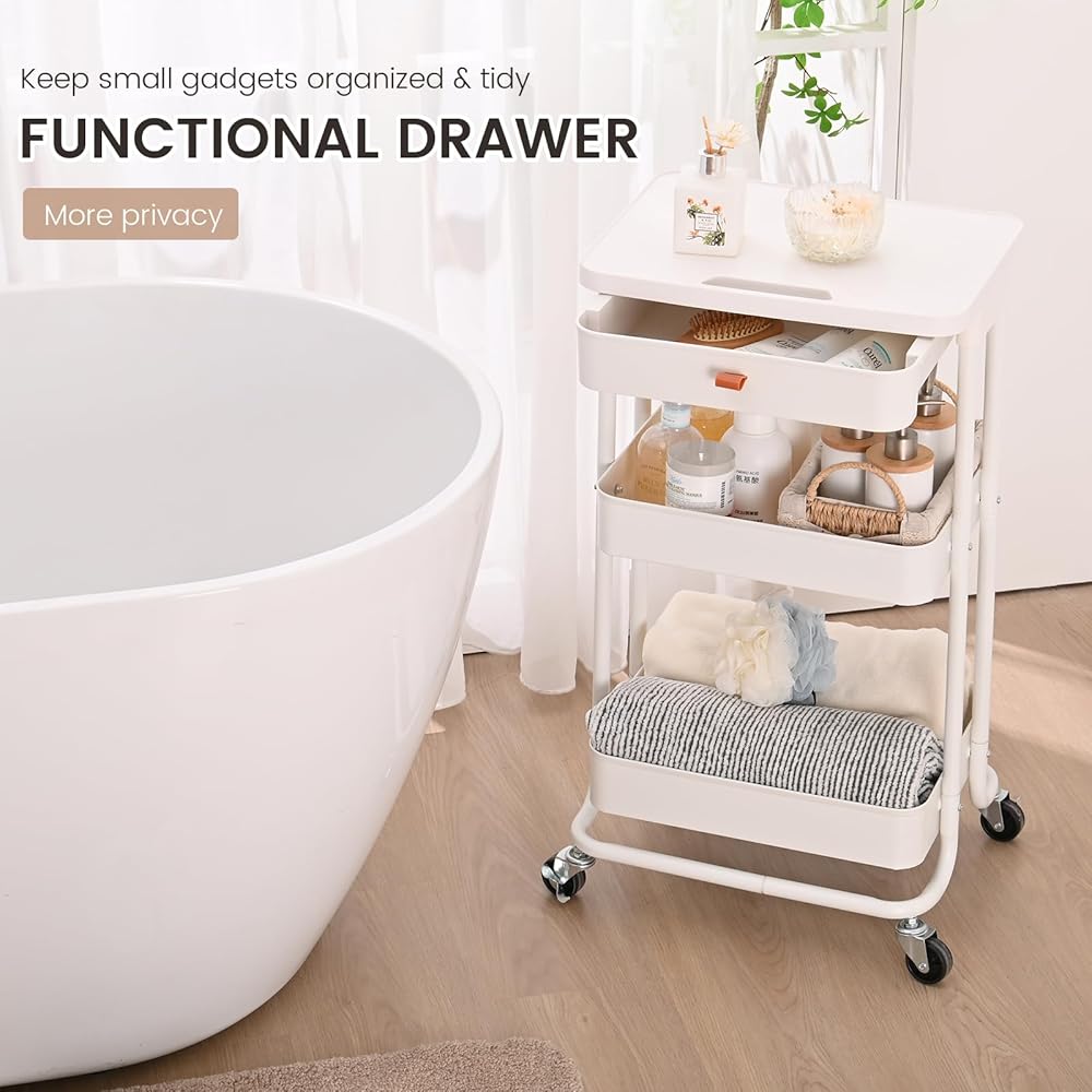 ♕ بناء قوي - عربة تقديم الطعام الدوارة المكونة من 3 طبقات مصنوعة بشكل جيد من سلال معدنية شديدة التحمل وأعمدة واقفة، ولوح طاولة ودرج بلاستيكي متين. عربة التخزين مطلية بطلاء مسحوق أنيق، وهي مضادة للصدأ وغنية المظهر