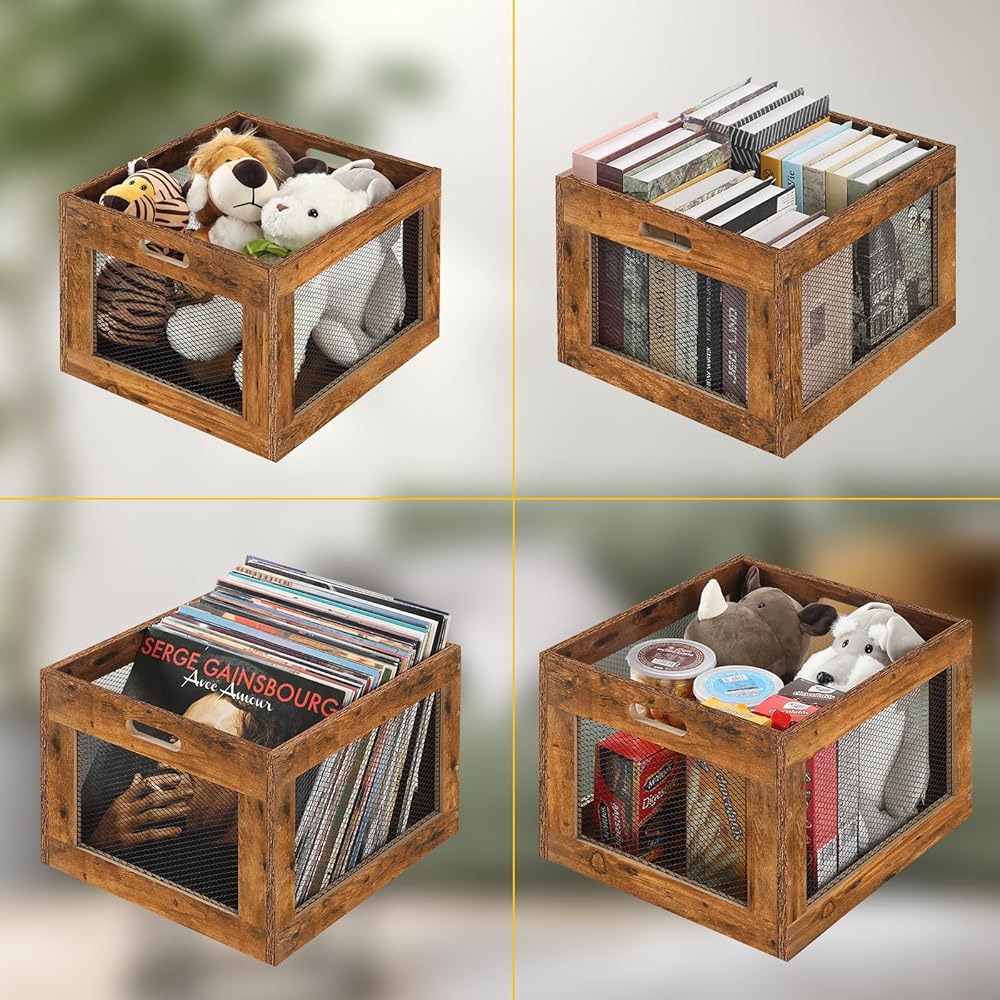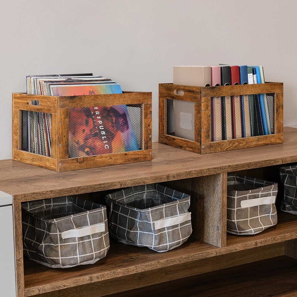 صندوق تخزين سجل الفينيل من هايترال، حامل سجل خشبي، صندوق تخزين متعدد الوظائف مع مقبض، لتخزين الكتب والوجبات الخفيفة والألعاب والمجلات في المنزل - عبوتان