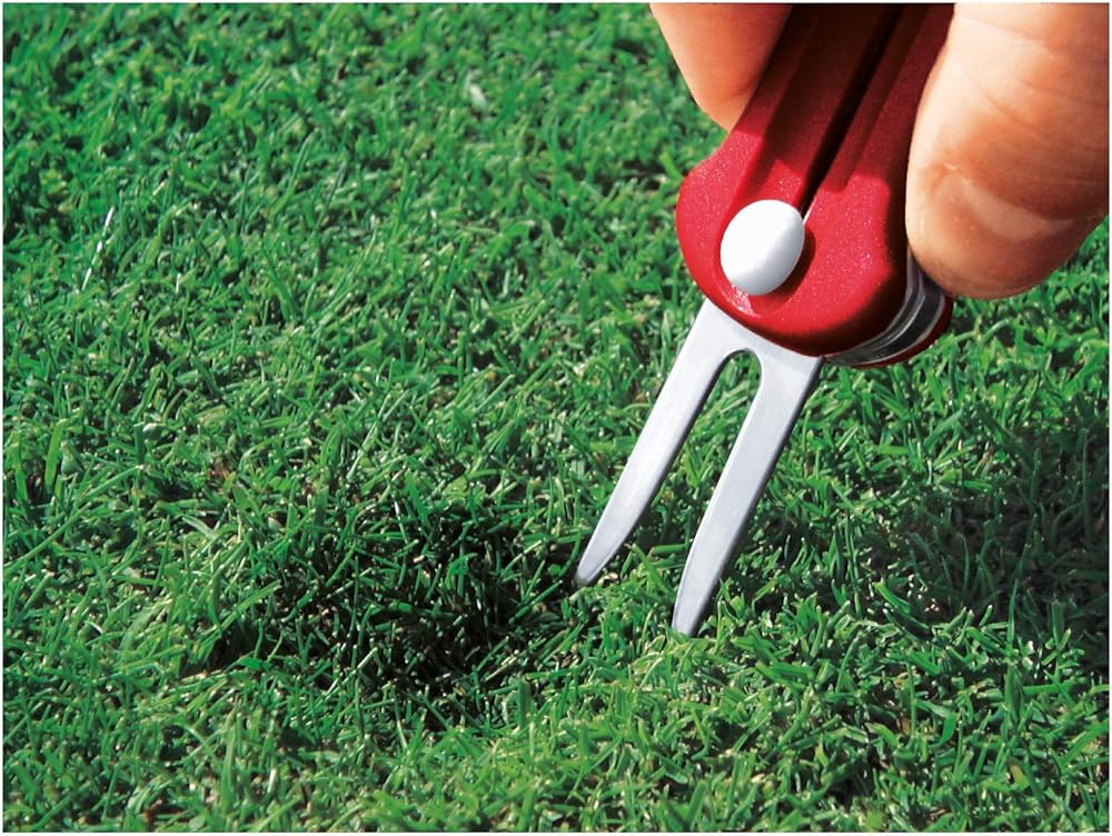 The locking divot repair tool easily slides forward to replace divots in the grass. When an implement is in use, the other tools retract into the handle for a comfortable grip. The groove cleaner blade can be used for both clearing the club head grooves and for punching the tee position, especially useful when the ground is hard or frozen.