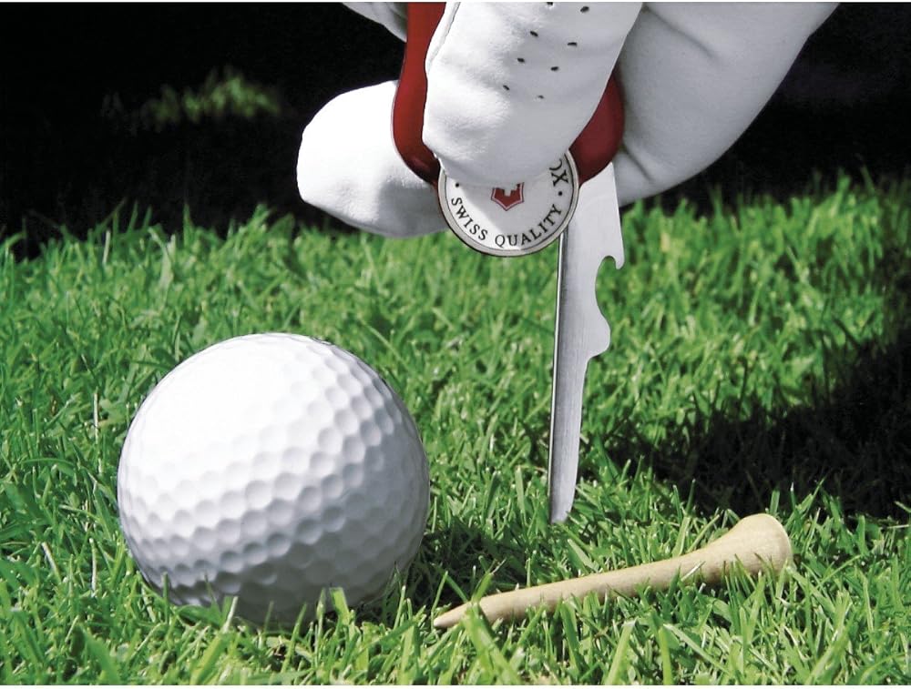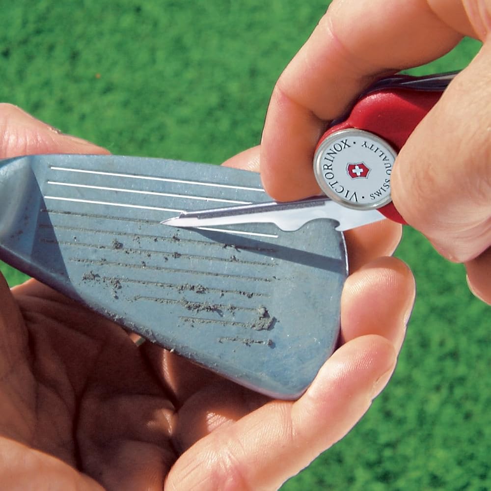 After you've used your Swiss Army Knife for all of its various applications, such as cutting open numerous boxes, you may notice that the blades begin to stick together. Opening and closing the blades in warm water several times will allow the tools to easily move again. Once they have dried, it is recommended, to apply a small drop of oil between the blade or tool shank and the spring. To optimally maintain the locking mechanism, periodically apply a drop of our recommended Swiss Army Knife Oil. Never put Swiss Army Knives in the dishwasher. From the renowned company that created the Swiss Army Knife a century ago comes the Swiss Army golf tool, a compact device designed specifically for the avid golfer. The golf tool comes with all the tools you need for a day on the course, including a one-handed divot repair tool, a removable ball marker, a tee punch, and a groove cleaner. As a result, you don't need to rummage through your golf bag several times a round looking for a specific tool. At the same time, the golf tool comes with several standard Swiss Army tools--including a nail file, blade, scissors, a toothpick, and tweezers--so you can also use the golf tool for around-the-house use. As with all Victorinox items, the golf tool is made to exacting standards, with dozens of steps going into its construction. Victorinox attends to every detail, from selecting the finest materials--including stainless steel for the blades and rust-free aluminum alloy for the separators--to performing the final inspection. In addition, each individual tool has been hardened in a different way to stand up to its designated use. The golf tool carries a lifetime warranty.