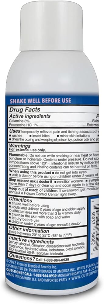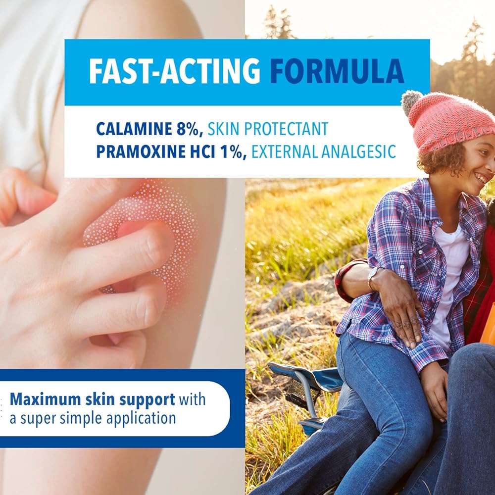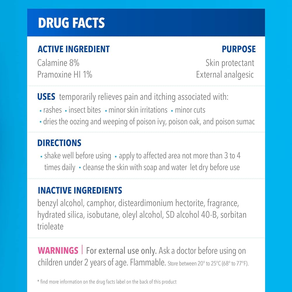 المكونات النشطة: يحتوي رذاذ التجفيف والتهدئة على 8% كالامين ليكون بمثابة واقي للبشرة و1% براموكسين هيدروكلوريد كمسكن خارجي يبدأ العمل عند التلامس للمساعدة في تخفيف الأعراض بسرعة.