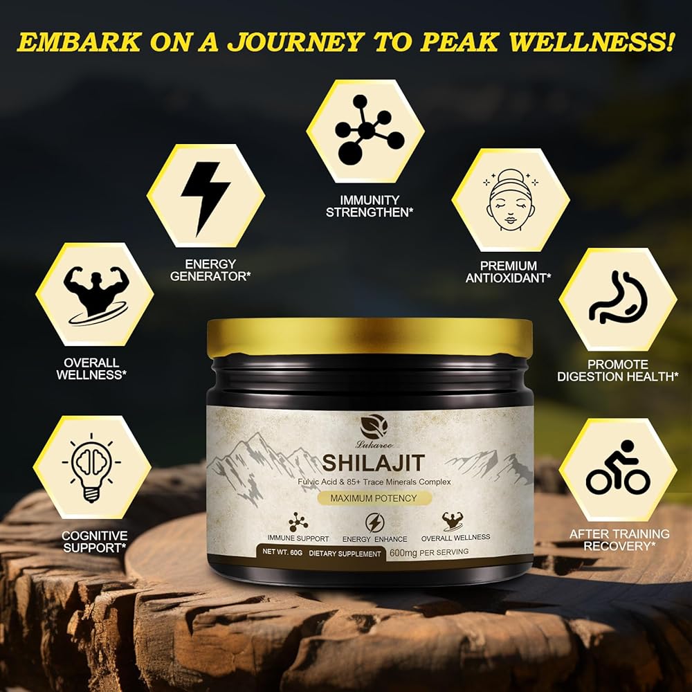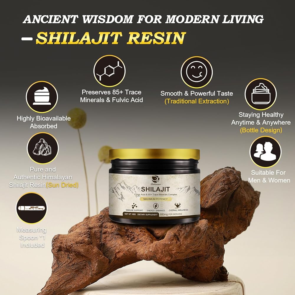 مفهوم جديد لاحتضان الرفاهية الشاملة: هل تشعر في كثير من الأحيان بالتعب في الحياة اليومية؟ لا يزود راتنج الهيمالايا الشيلاجيت جسمك بأكثر من 85 من المعادن النزرة ويجمع مع مركب حمض الفولفيك والديوميك للمساعدة في مستوى الطاقة في جسمك، ولكن أيضًا مكمل الشيلاجيت الخاص بنا يساعد على القدرة على التحمل والإنتاجية، ويزودك بالطاقة، ويثبت مزاجك ويحسن حالتك المزاجية. المناعة، وتحسين التفكير والإدراك والهضم والتمثيل الغذائي لدى الرجال والنساء. استمتع براحة البال والنتائج المثالية.*