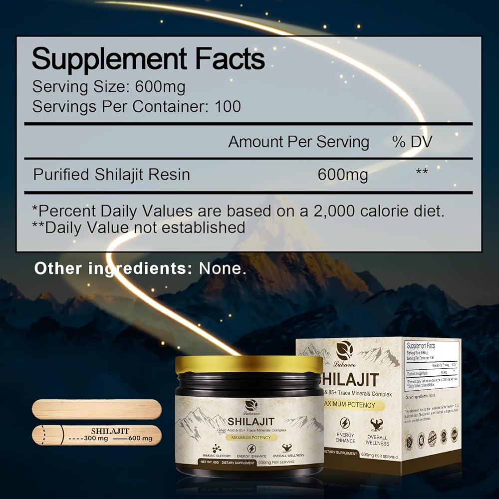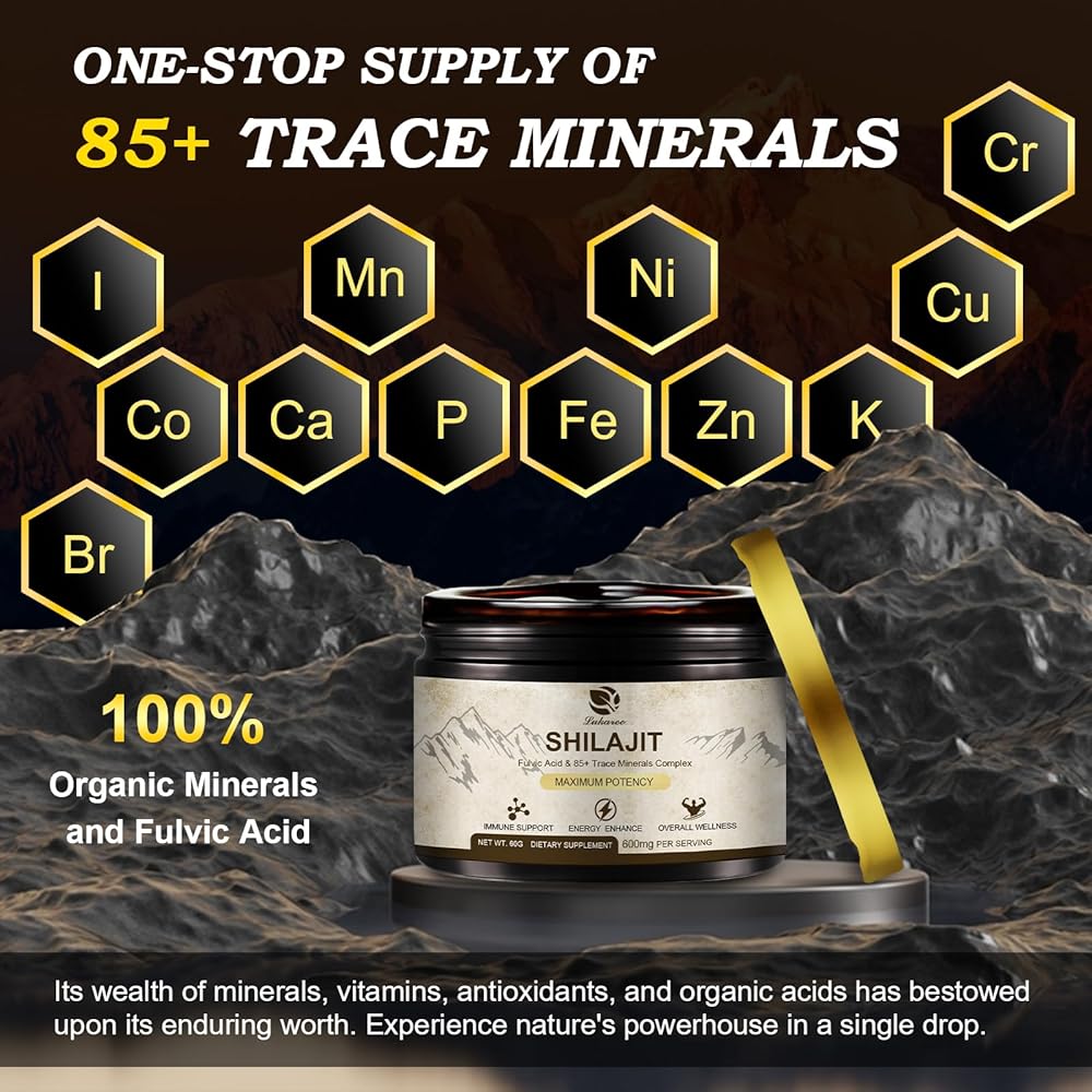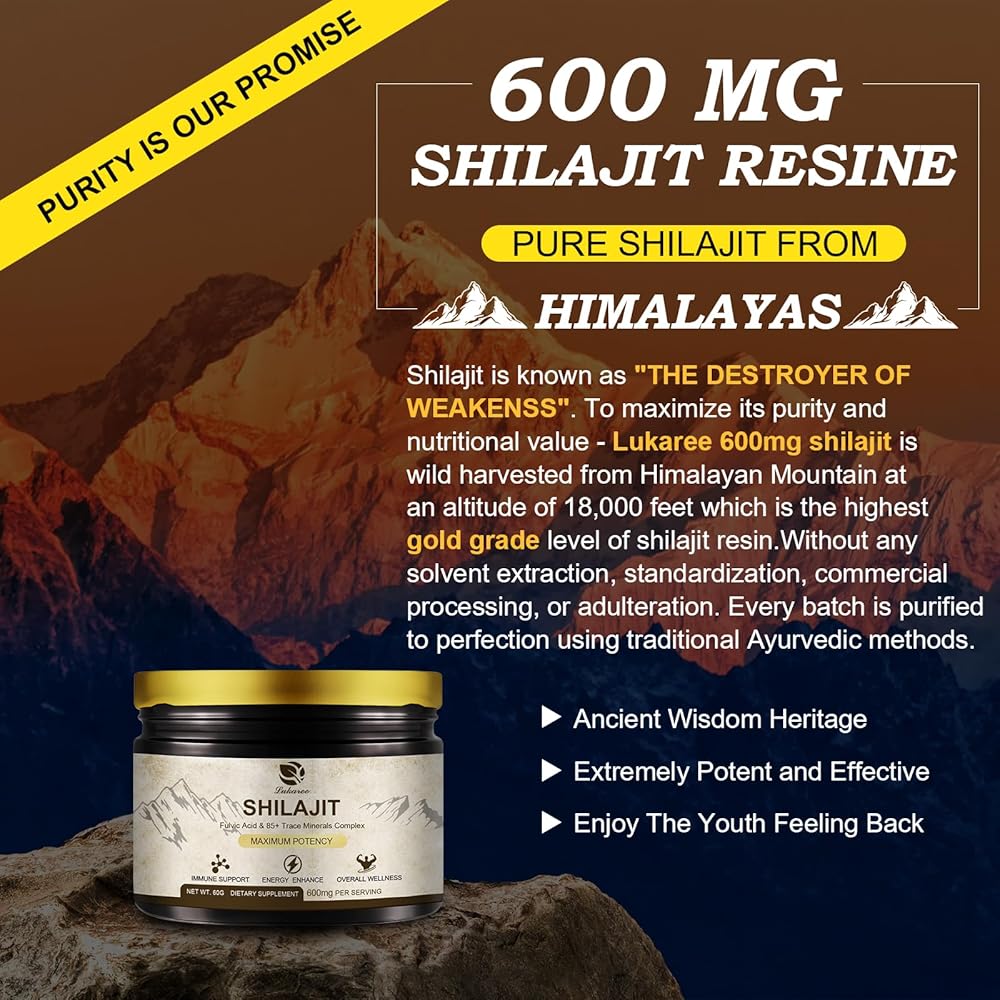 مصدر الهيمالايا الأصلي: أطلق العنان لقوة شيلاجيت 600 مجم مباشرة من قوة جبال الهيمالايا! تم حصادها حديثًا من القمم البكر على ارتفاع 18000 قدم، ولا يوجد تلوث في هذه الجبال العالية على الإطلاق. راتنج الشيلاجيت الذي يتم حصاده بريًا على هذا الارتفاع هو من الدرجة الذهبية الممتازة، مع محتوى غذائي أعلى ونقاء من المكملات الغذائية الأخرى. نحن ملتزمون بالقيمة الحقيقية مقابل المال. متوفر في شكل الراتينج الناعم الشيلاجيت، وهو إضافة رائعة لتعزيز يومك بقوة!*