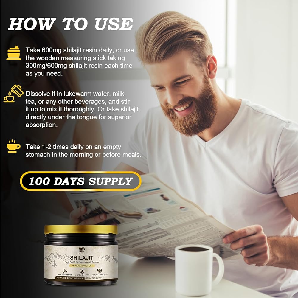 تتضمن ملعقة قياس وإمداد لمدة 100 يوم: نقدم ملاعق قياس، ونذوبها في الماء الفاتر، أو الحليب، أو الشاي، أو أي مشروبات أخرى، ونحركها لمزجها جيدًا أو تناولها مباشرة تحت اللسان، وهو مذاق سلس حقًا. نحن نتحكم في مكمل راتنج الشيلاجيت النقي بقدرة رطوبة تبلغ 15% لضمان كل جرعة تقديم مثالية. معبأة في مرطبانات زجاجية داكنة مزدوجة الغلق، والتي توفر أقصى قدر من الحماية بعيدًا عن تأثير الضوء، بحيث تطيل فعالية راتنج الشيلاجيت الخاص بك.*