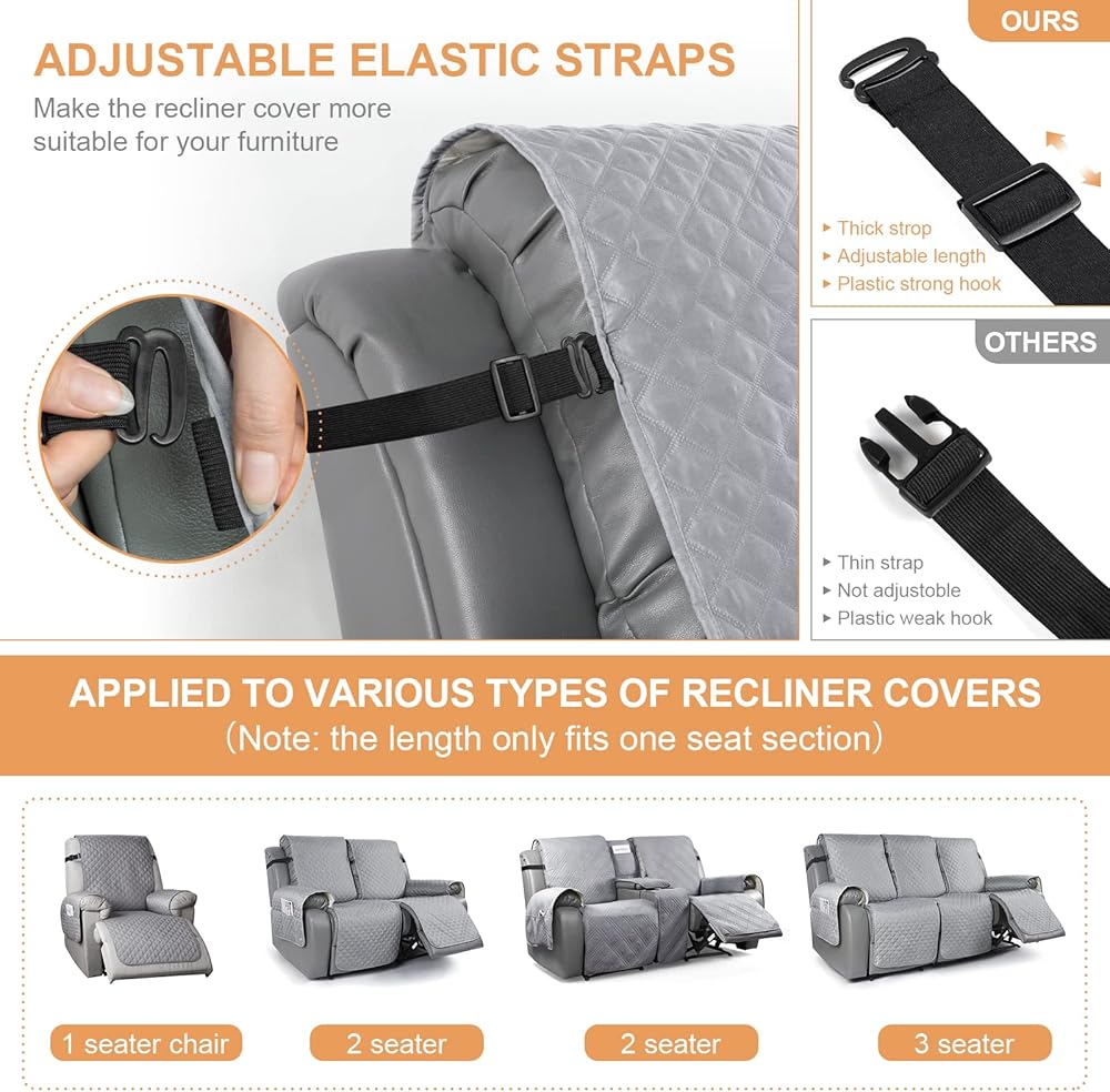 Adjustable length- All straps are adjustable. Works with most types of recliner chair cover, loveseat recliner cover, 3 seater recliner sofa cover.