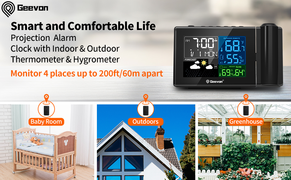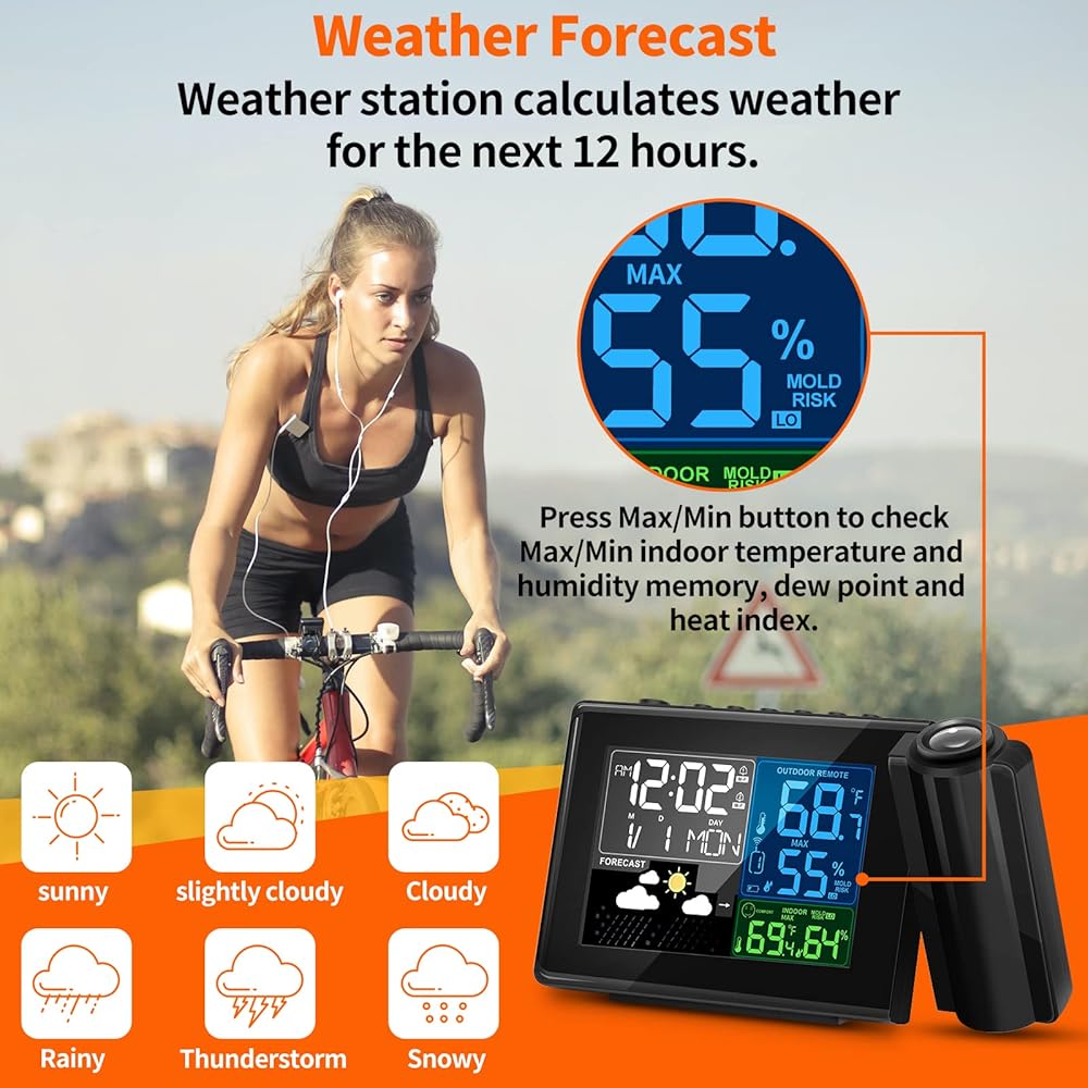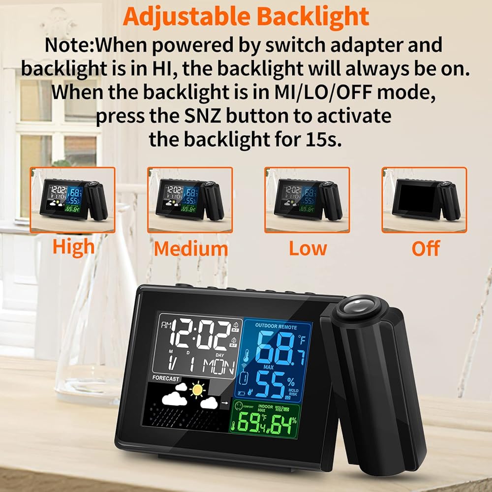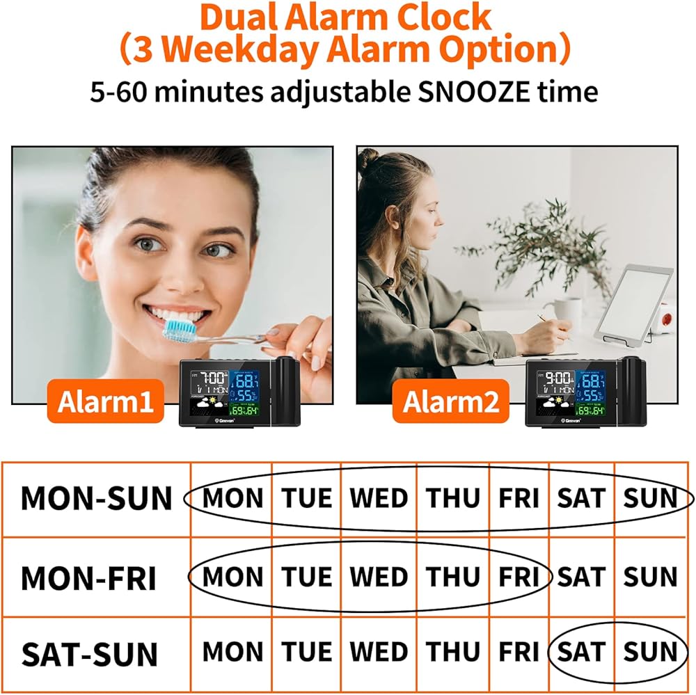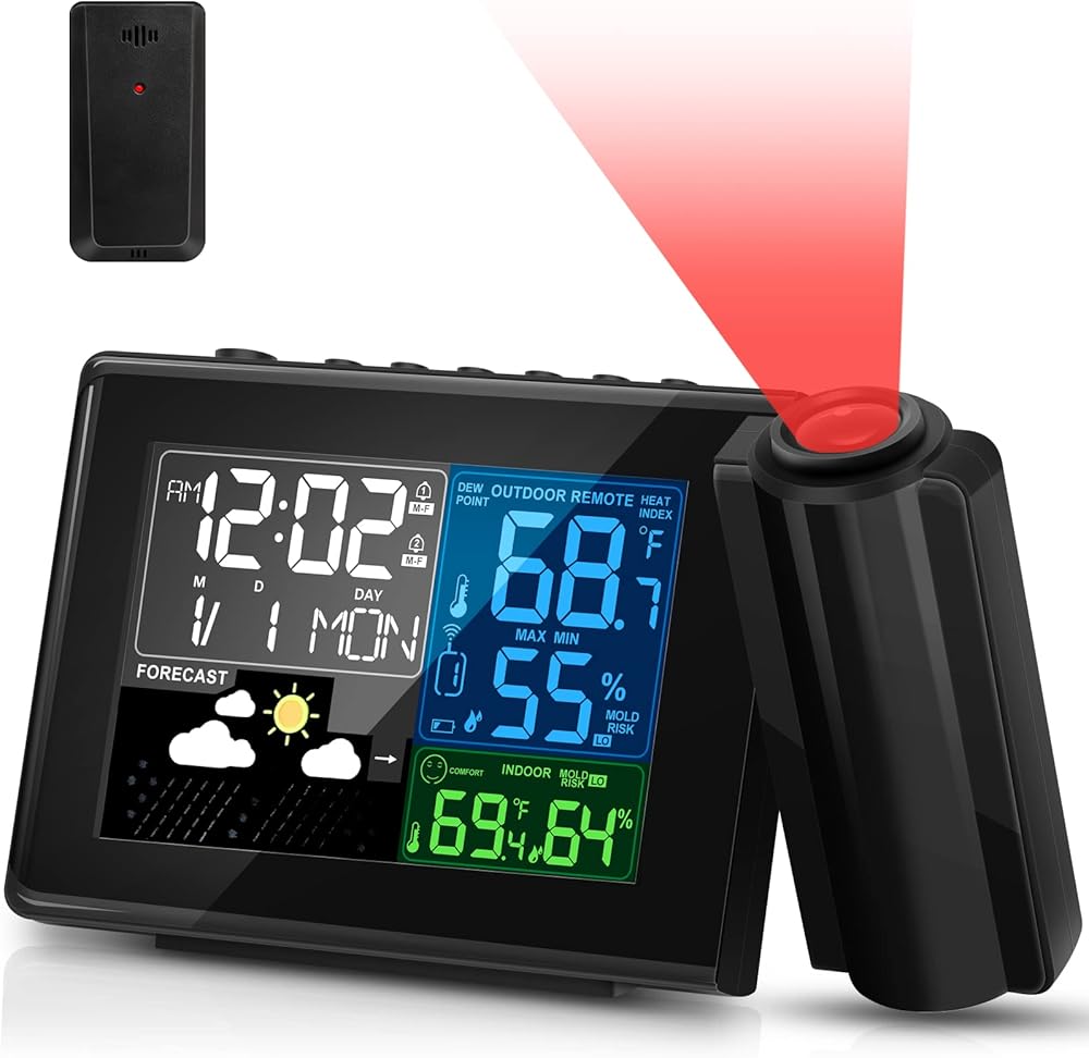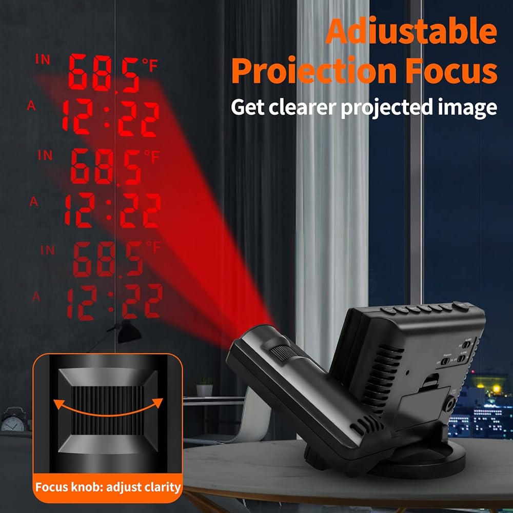 ساعة منبه إسقاط من جيفون مع تركيز الإسقاط، مقياس رطوبة درجة الحرارة اللاسلكي في الأماكن المغلقة والخارجية، إضاءة خلفية قابلة للتعديل، توقعات الطقس، إنذار مزدوج لسقف غرفة النوم، يعمل بالتيار المتردد والبطارية