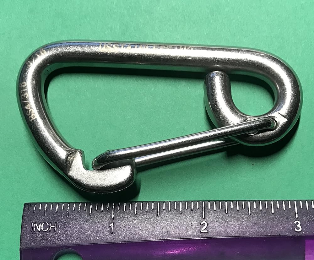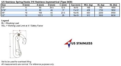 This is for two (2) quality marine grade stainless steel (AISI 316) spring hooks 5/16". Each spring hook is stamped 316 and laser etched 5/16" with the makers mark. The spring hooks are marked in the US specification style of 5/16". The Metric equivalent is generally considered to be 8mm. Not to be used for overhead lifting. AISI 316 stainless is a premium grade of stainless and is considered by many to be best in class. 316 stainless is corrosion resistant and very durable even in the harshest of conditions.