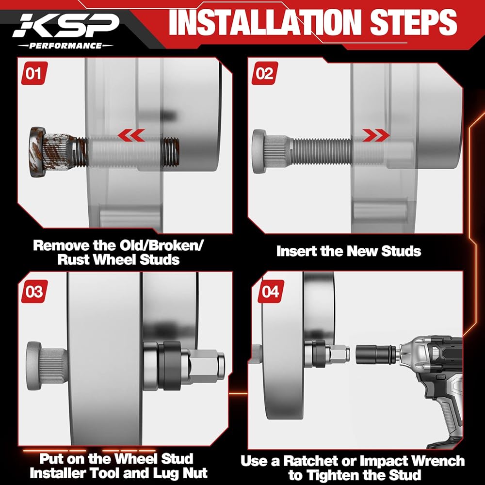 سهل الاستخدام: أولاً، قم بإزالة مسامير المصنع/المكسورة/الصدأ. ثانيًا، قم بإدخال البراغي الجديدة من الجزء الخلفي للفتحة الفارغة الموجودة على المحور أو فاصل العجلة. ثم ضع مثبت مسمار العجلة KSP على المسامير. أخيرًا، قم بربط صامولة العروة على الأداة، ثم اسحب المسمار إلى مكانه باستخدام السقاطة أو مفتاح الربط.