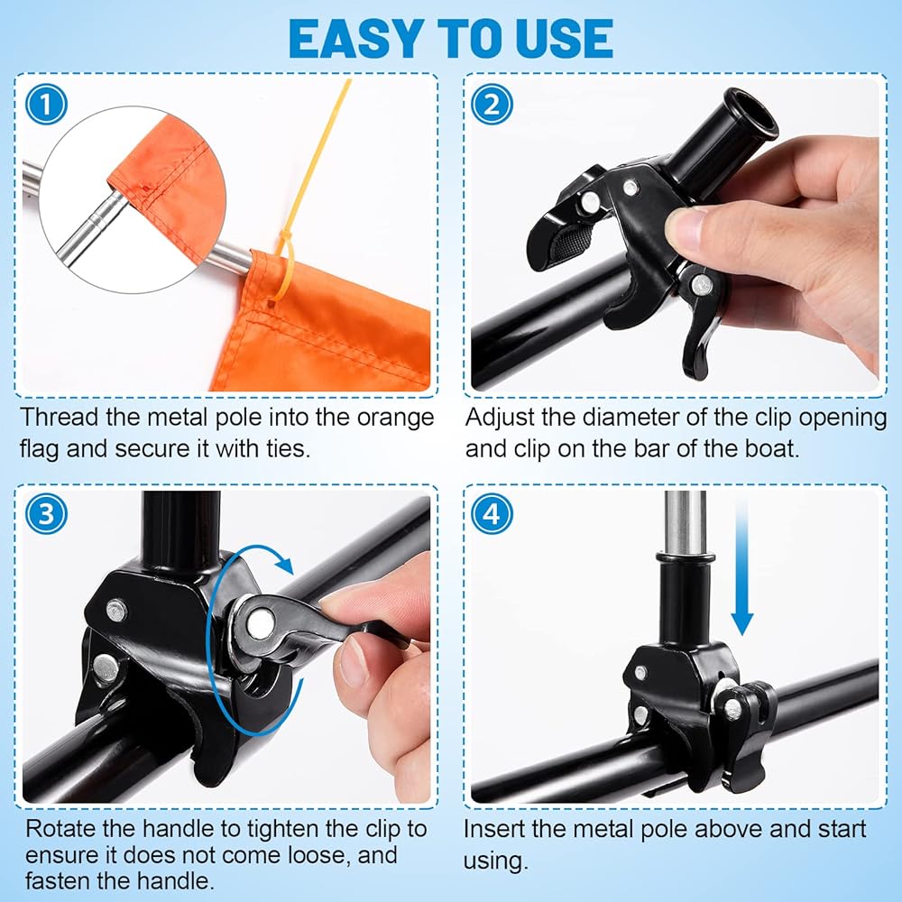 سهل التركيب: مشبك التثبيت لعلم سلامة القوارب هو ضبط حجم الفتحة من خلال المسمار لجعلها تناسب حجم القضبان والقضيب العمودي. سهل التركيب والإزالة، لا تقلق من أنك لا تعرف كيفية التركيب، ويمكن أن يساعدك الدليل المصاحب أيضًا على التركيب بشكل أسرع.