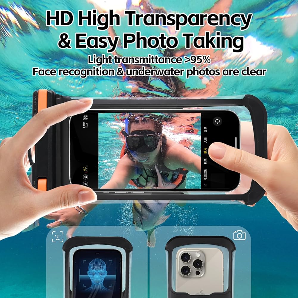 • [عرض عالي الدقة والتقاط] مادة شفافة للغاية (نفاذية الضوء بنسبة 99%) تحافظ على عرض محتوى شاشة هاتفك بوضوح وتعمل الكاميرا بشكل صحيح. لن يؤثر جراب الهاتف المقاوم للماء على معرف الوجه ومكالمات الفيديو والتقاط الصور/مقاطع الفيديو، مما يسمح لك بتسجيل اللحظات الجميلة حتى تحت الماء. يرجى استخدام أزرار الصوت لالتقاط الصور تحت ظروف المياه العميقة.