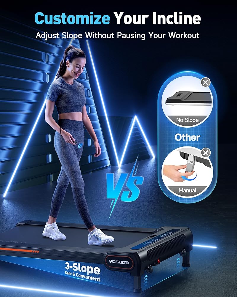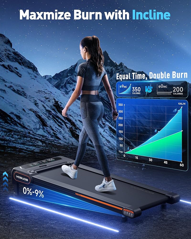 【زيادة حرق الدهون إلى أقصى حد مع الميل】اختبر مضاعفة حرق الدهون مع وسادات المشي YOSUDA، التي تتميز بميل يصل إلى 9%. ارفع كفاءة التمرين دون عناء وحقق أهداف اللياقة البدنية الخاصة بك بشكل أسرع.