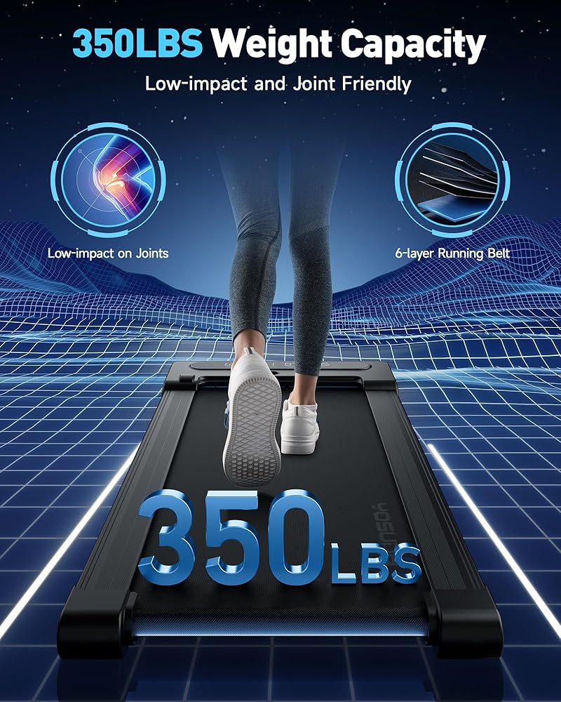 【قوية ومريحة】جهاز المشي الموجود تحت المكتب، المصنوع من البوليمرات والفولاذ الفاخر، يدعم 350 رطلًا دون عناء. يوفر حزامه مقاس 42.5 × 16.9 بوصة المزود بحزام مكون من 6 طبقات حماية ممتازة للركبة وممارسة التمارين الرياضية بحرية.