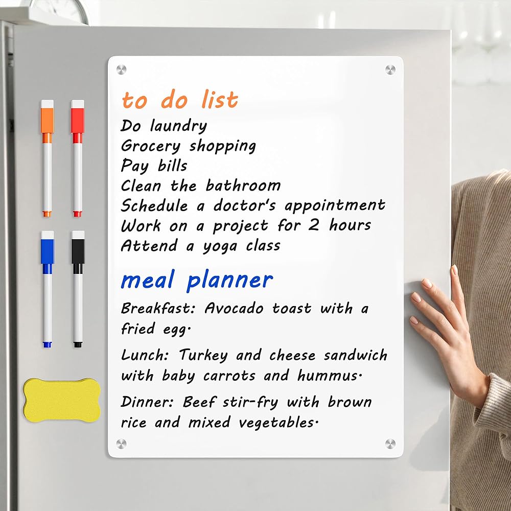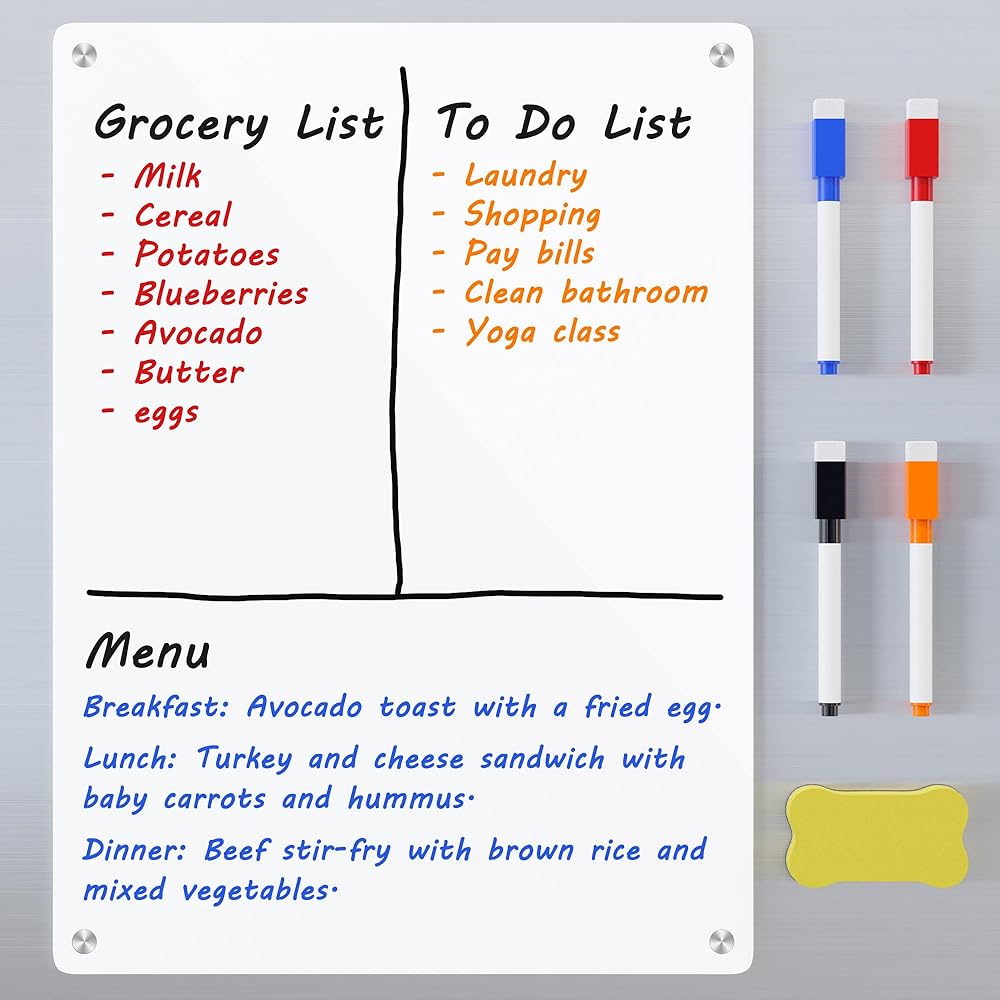 لوح مسح جاف للثلاجة من السبورة البيضاء المغناطيسية، لوح أبيض لامع مقاوم للبقع من الأكريليك للثلاجة، مذكرة مذكرة صغيرة مزدوجة الجوانب مقاس 12 × 9 بوصة للقيام بها/قائمة البقالة، تتضمن ممحاة واحدة و4 أقلام تحديد