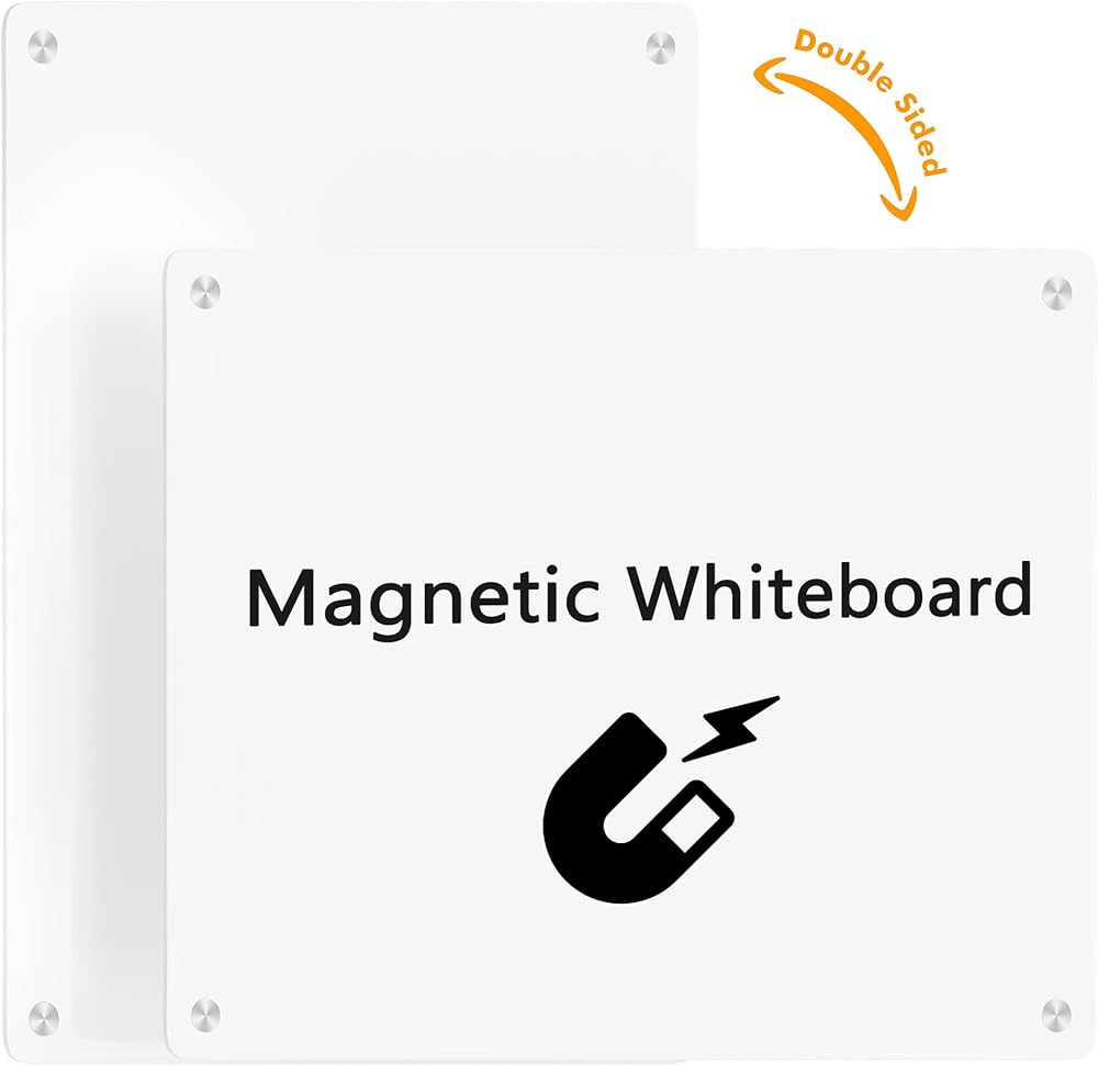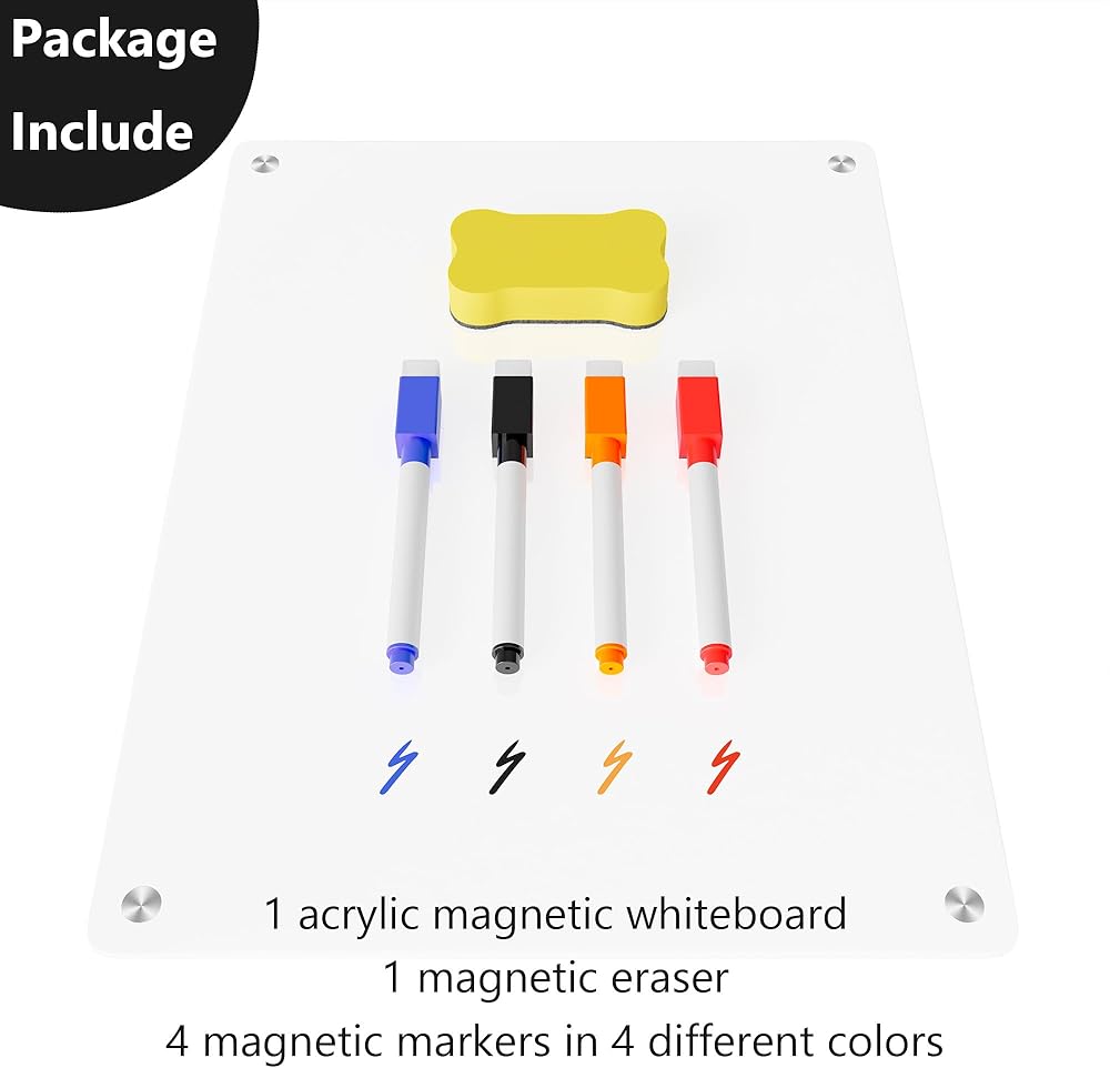STORNG MAGNETIC: 4 pcs strong magnets enable the acrylic dry erase board to stick firmly to the fridge even when you slam the fridge door. (Note: It is not suitable for non-magnetic stainless steel fridge) Imagine it, a glass sense whiteboard attached to your fridge, it will become the focal point of your kitchen.