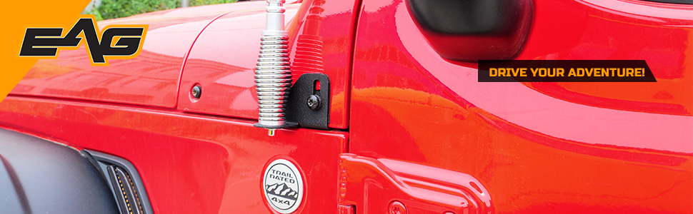 - سيعمل حامل الهوائي المصمم خصيصًا على تثبيت الهوائي الخاص بك بقوة في مكانه على جانب سيارة رانجلر أو مفصل الزجاج الأمامي.