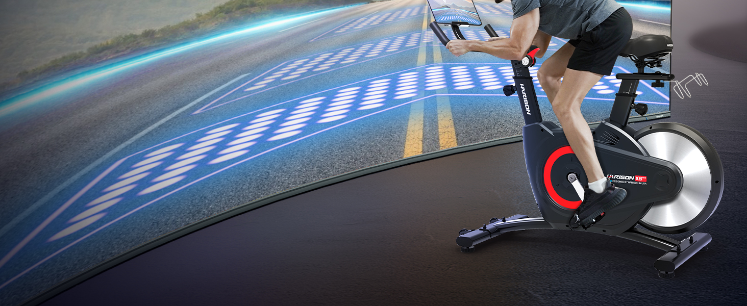[اتصال بلوتوث متوافق] يمكن توصيل دراجة التمرين HARISON بتطبيق البلوتوث المتضمن Kinomap وSPAX وZwift، مما يسمح لك باختيار دورات ركوب الدراجات وتسجيل بيانات التمرين في الوقت الحقيقي مثل الوقت والسعرات الحرارية وعداد المسافات والسرعة والمسافة والنبض.