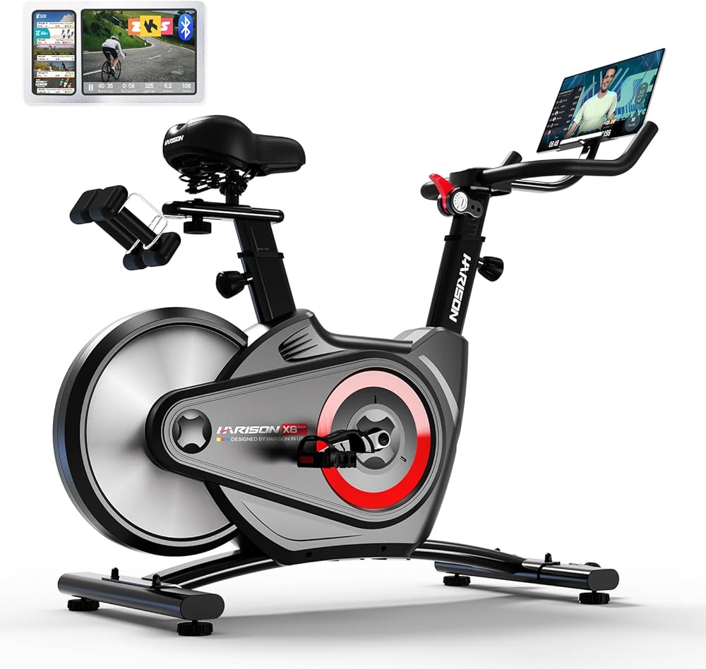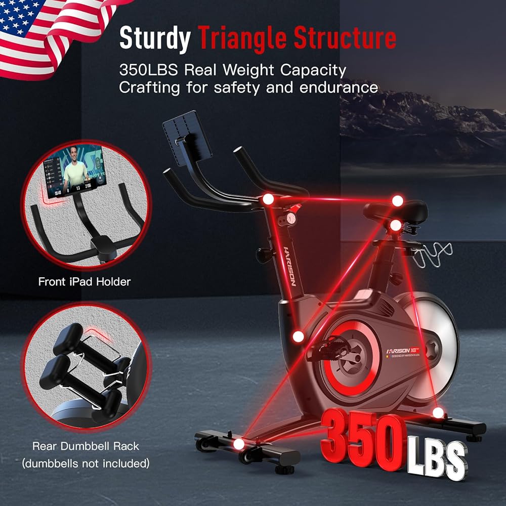 【حرفية رائعة مع تصميم مدروس】 دراجات هاريسون الثابتة للمنزل مجهزة بحامل آيباد، مما يسمح لك بالاستمتاع بالترفيه أثناء التمرين. يمكّنك حامل الدمبل الخلفي من حمل الدمبل ووضعه في أي وقت لتمرين عضلات الساق والذراع في وقت واحد، مما يحسن كفاءة التمرين.