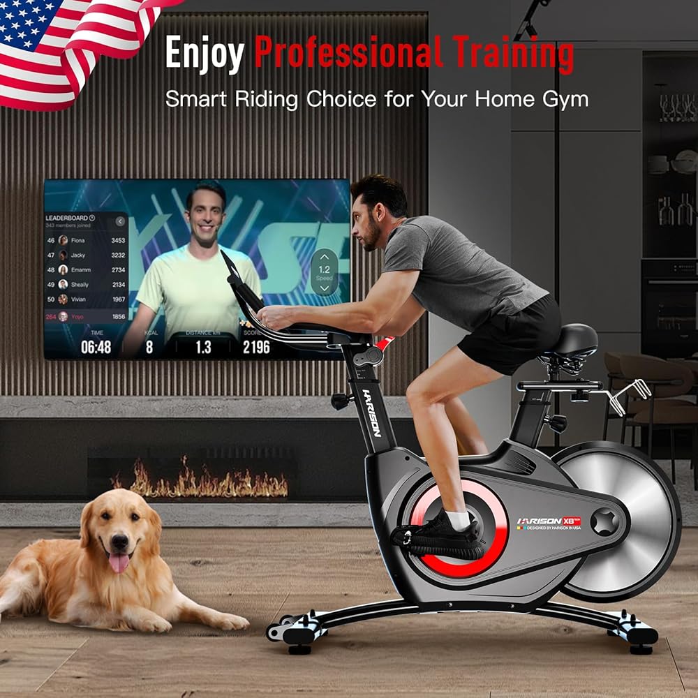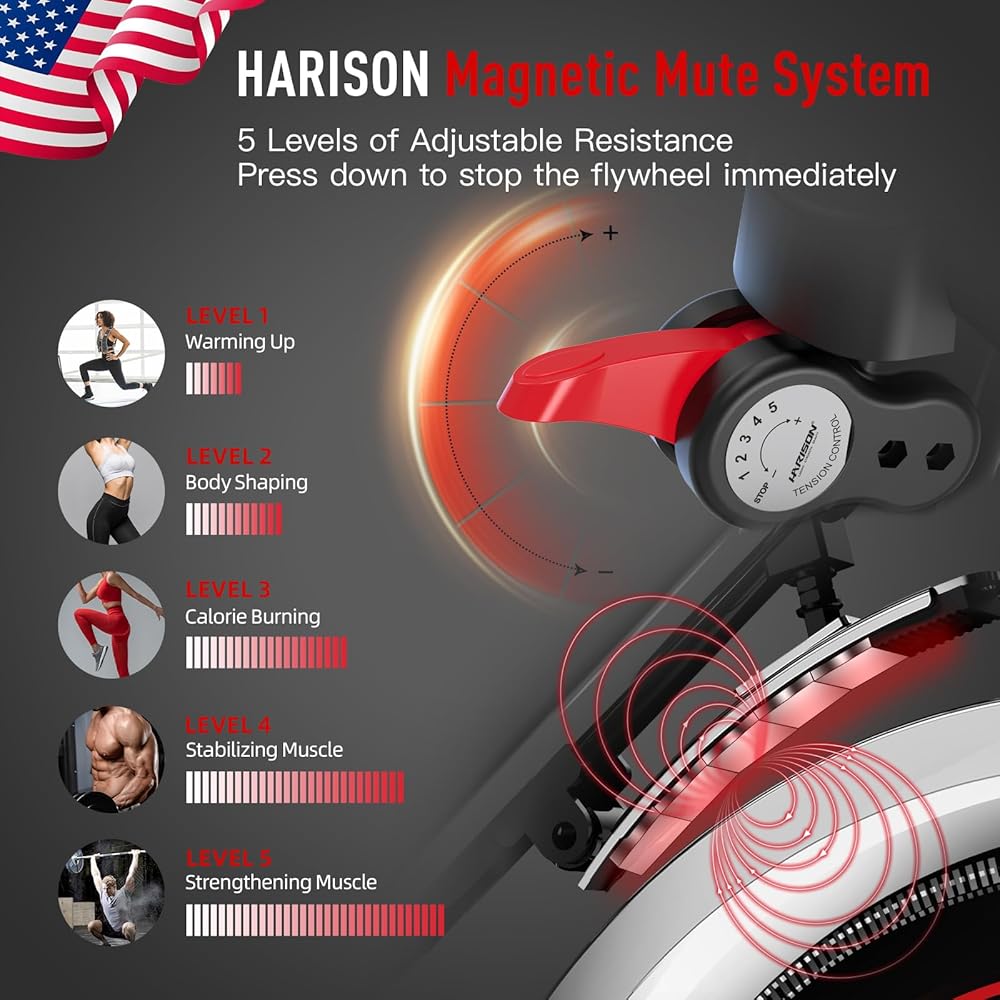 【مقاومة مغناطيسية ثنائية الاتجاه】دراجة تمارين داخلية هاريسون مجهزة بتقنية معايرة التوازن الديناميكي لتعزيز ثبات الركوب. تتميز بحذافة خلفية لتوفر لك تجربة ركوب الدراجات على الطرق أكثر واقعية. مع خمسة مستويات مقاومة، تلبي دراجة التمرين هاريسون احتياجات اللياقة البدنية المتنوعة الخاصة بك بما في ذلك الإحماء وتشكيل الجسم وبناء العضلات.