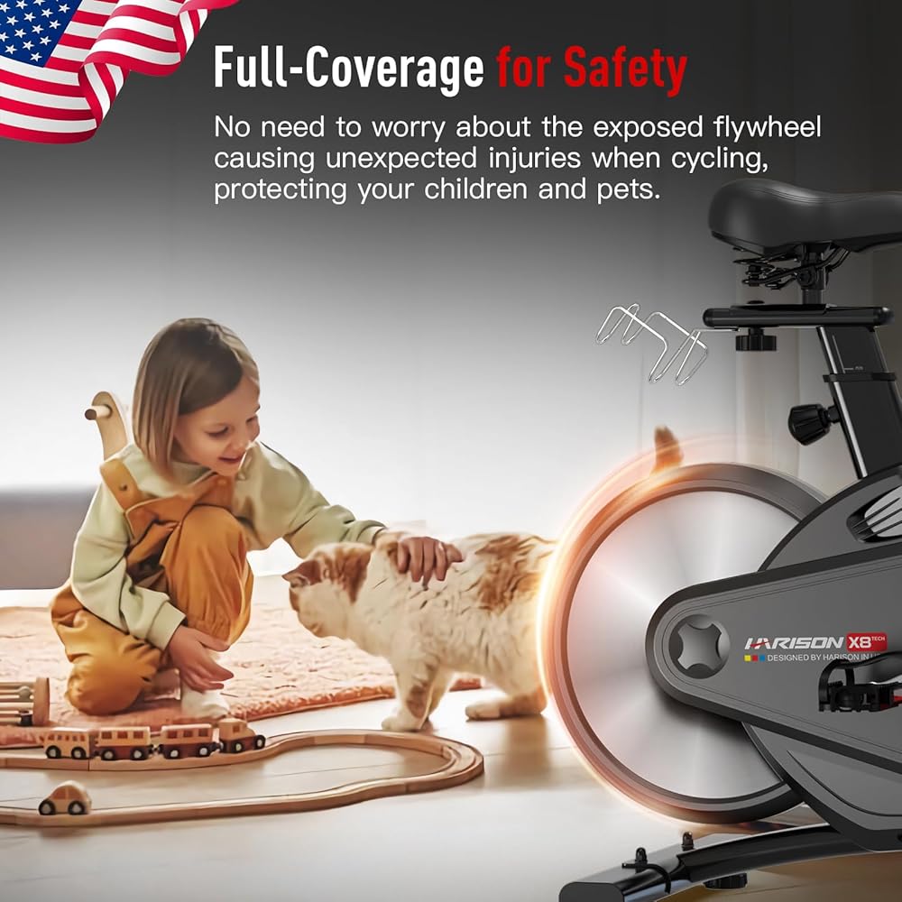 【دولاب الموازنة مغطى بالكامل من أجل السلامة】تتميز دراجة التمرين HARISON بعجلة موازنة مغطاة بالكامل بزاوية 360 درجة، مما يقلل من خطر الإصابات العرضية الناجمة عن دولاب الموازنة المكشوف أثناء ركوب الدراجات. هذا التصميم المغطى بالكامل يقلل من الضوضاء الناتجة أثناء الركوب، مما يخلق تجربة ركوب أكثر هدوءًا لصالة الألعاب الرياضية المنزلية الخاصة بك. يمنع الغطاء دخول الحطام إلى دولاب الموازنة، مما يطيل عمر هذه الدراجة الثابتة ويقلل احتياجات الصيانة.