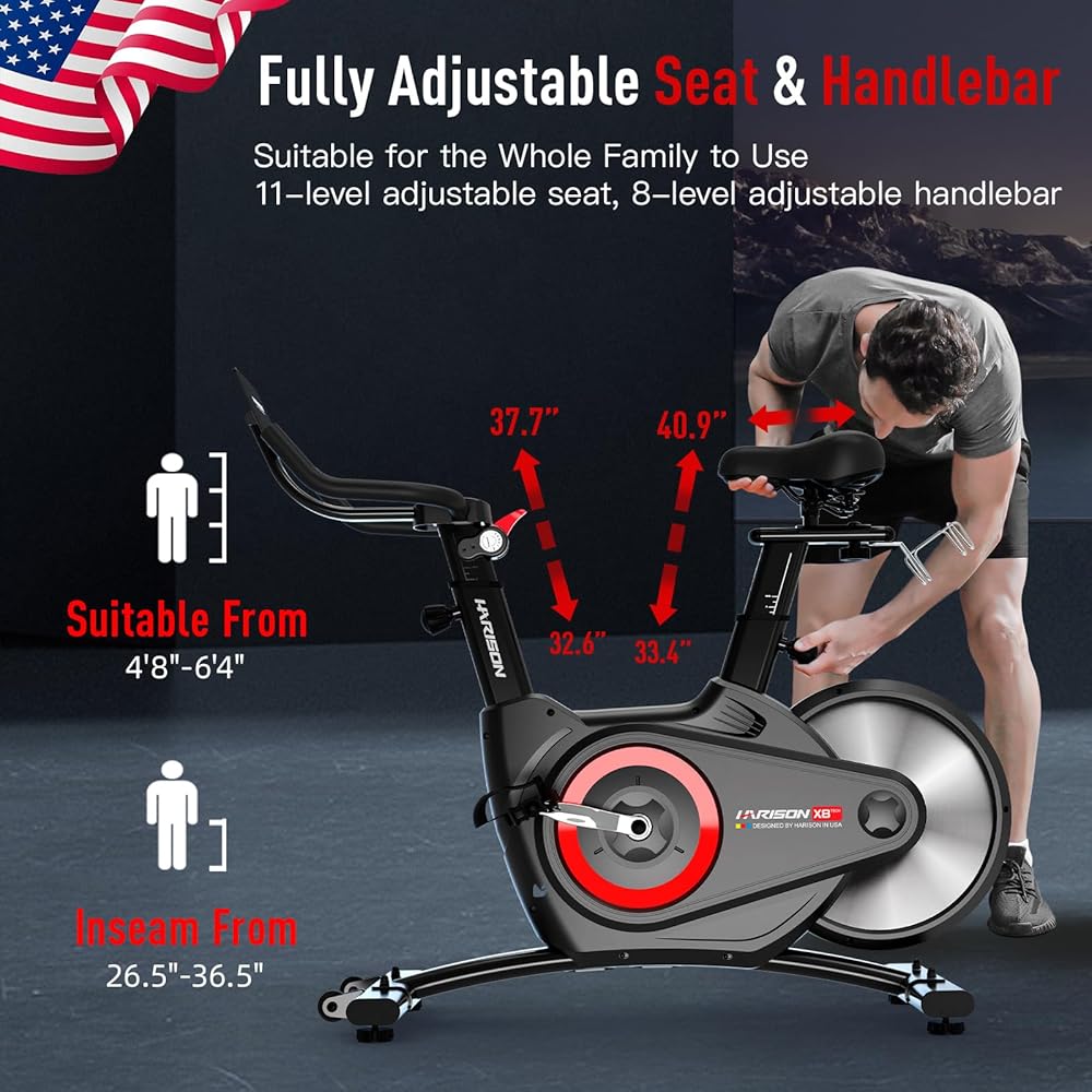【دراجة تمرين قابلة للتعديل بالكامل】يحتوي مقعد دراجة HARISON الداخلية على 11 مستوى لتعديل الارتفاع والمقود يحتوي على 8 مستويات لتعديل الارتفاع، مما يلبي الاحتياجات المتنوعة للأفراد ذوي الأطوال المختلفة. الارتفاع المناسب: 4.8-6.4 قدم، الدرزة الداخلية المناسبة: 26.5-36.5 بوصة.