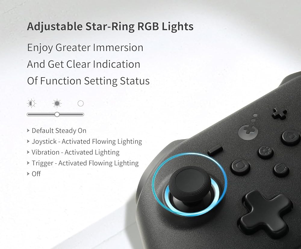 وظائف الألعاب المحسّنة: يشير ضوء Star-Ring RGB إلى ثلاثة حساسية لعصا التحكم وأعمدة الدوران ذات 6 محاور وNFC-Amiibo ووظائف التبديل المستيقظ ومساعدة هدف الحركة الحاصلة على براءة اختراع مع تعديل حساسية 3 مستويات لألعاب FPS.