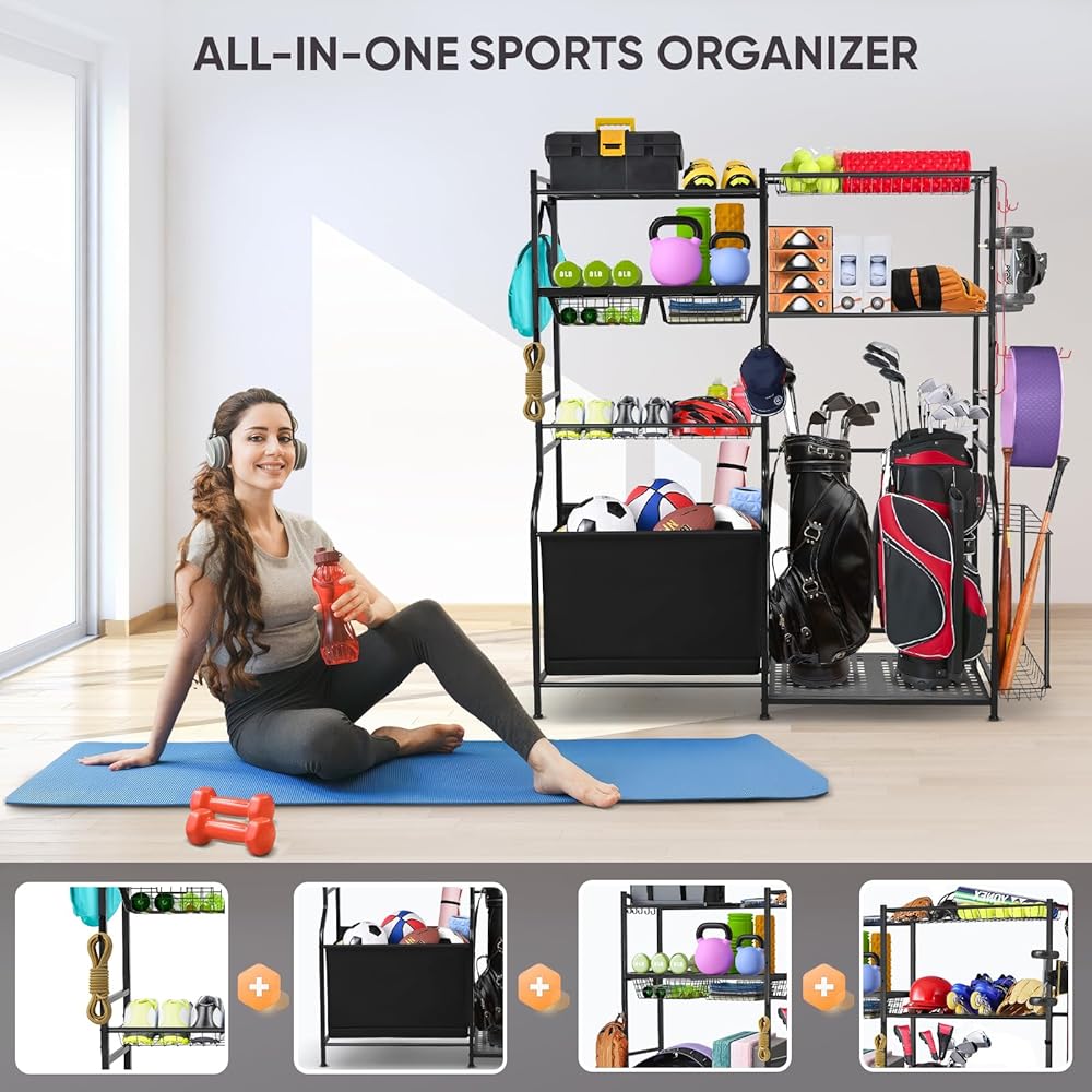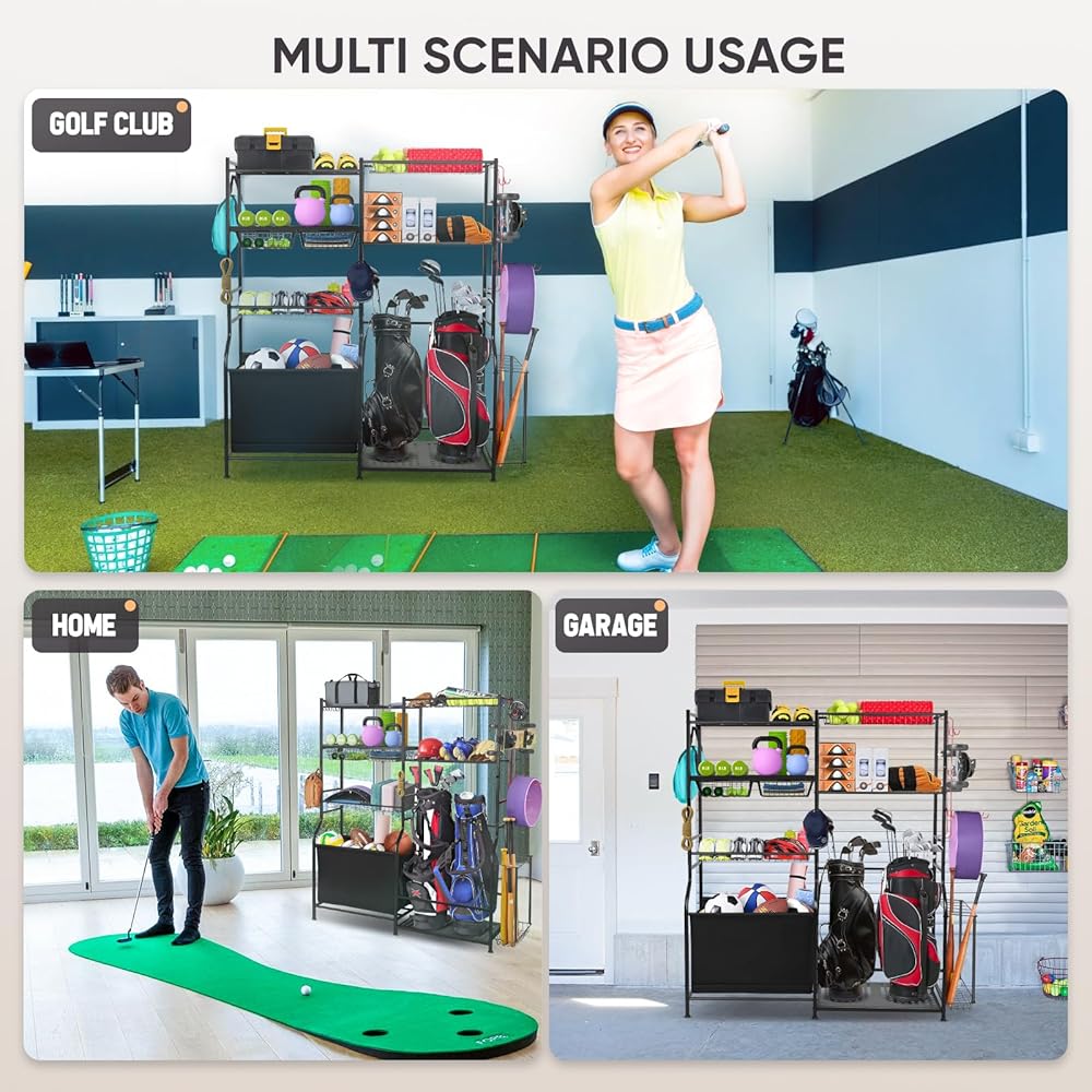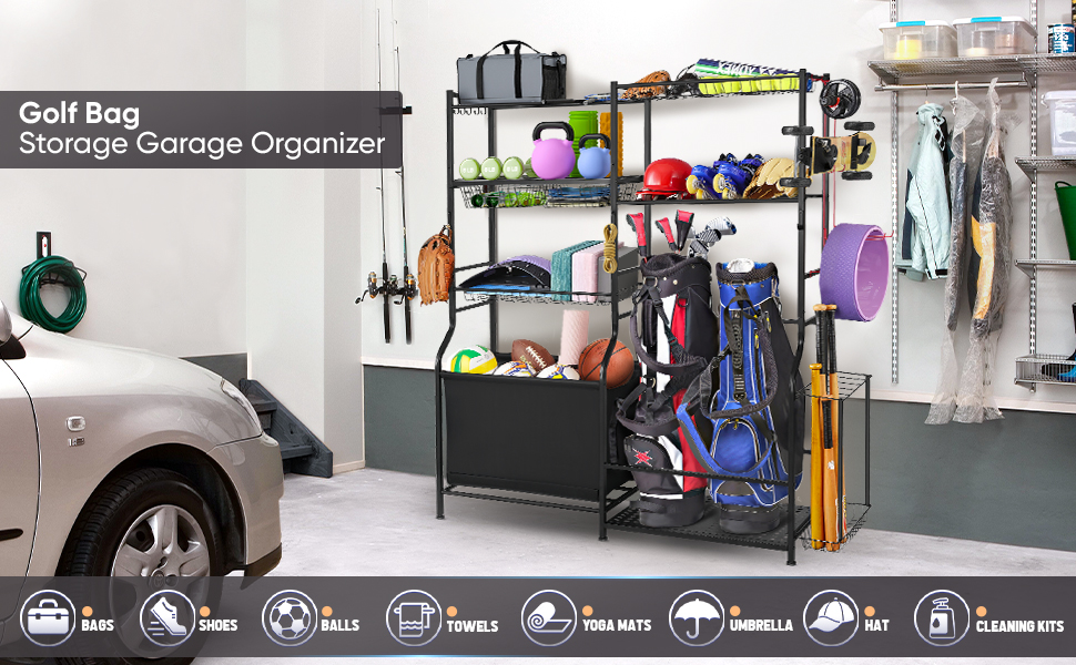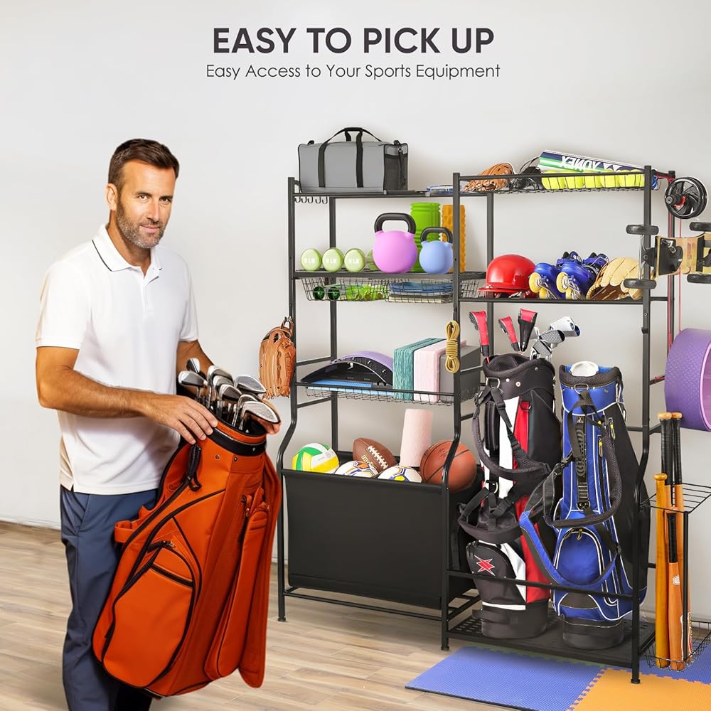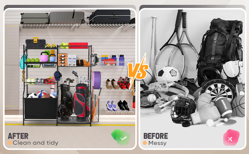 حافظ على تنظيم المعدات الرياضية. قل وداعًا لفوضى المرآب! يتميز منظم التخزين الرياضي الخاص بنا بحامل جولف، ومنظم كرات، و5 أرفف تخزين، وحامل سجادة يوجا جانبي، وشماعة تخزين جانبية، و5 حوامل مضرب، وخطافات تخزين متعددة، مما يحافظ على جميع معداتك منظمة ويمكن الوصول إليها بسهولة.