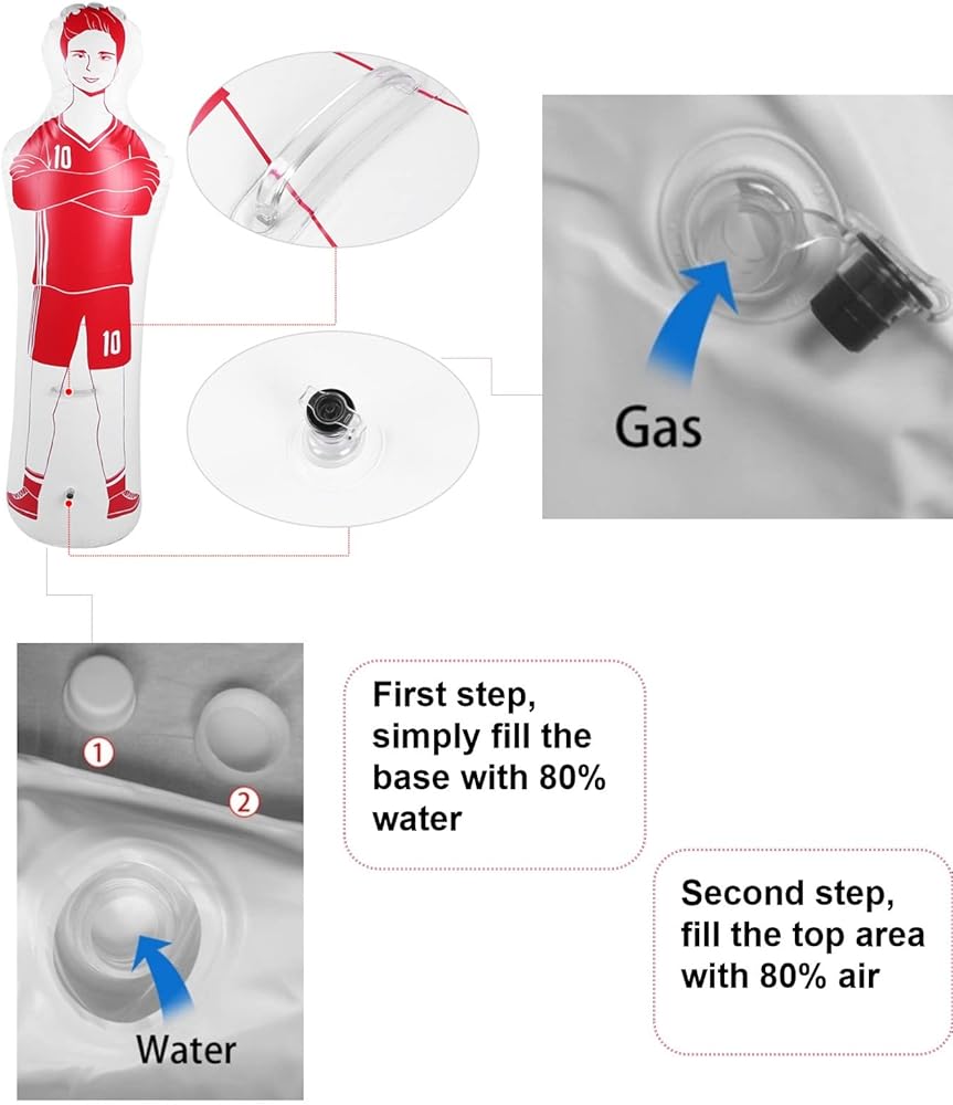 سهلة الاستخدام: دمية كرة القدم سهلة الاستخدام. الخطوة الأولى، ببساطة املأ القاعدة بالماء. الخطوة الثانية، املأ المنطقة العلوية بالهواء. لا يمكن أن يكون أسهل. بعد ملئها بالماء والهواء، يمكن ركل دمية كرة القدم بحرية، ولن تسقط. نصائح ودية: بعد الاستخدام، يرجى تصريف الهواء والماء من الدمية، مما يمكن أن يطيل عمر المنتج.
