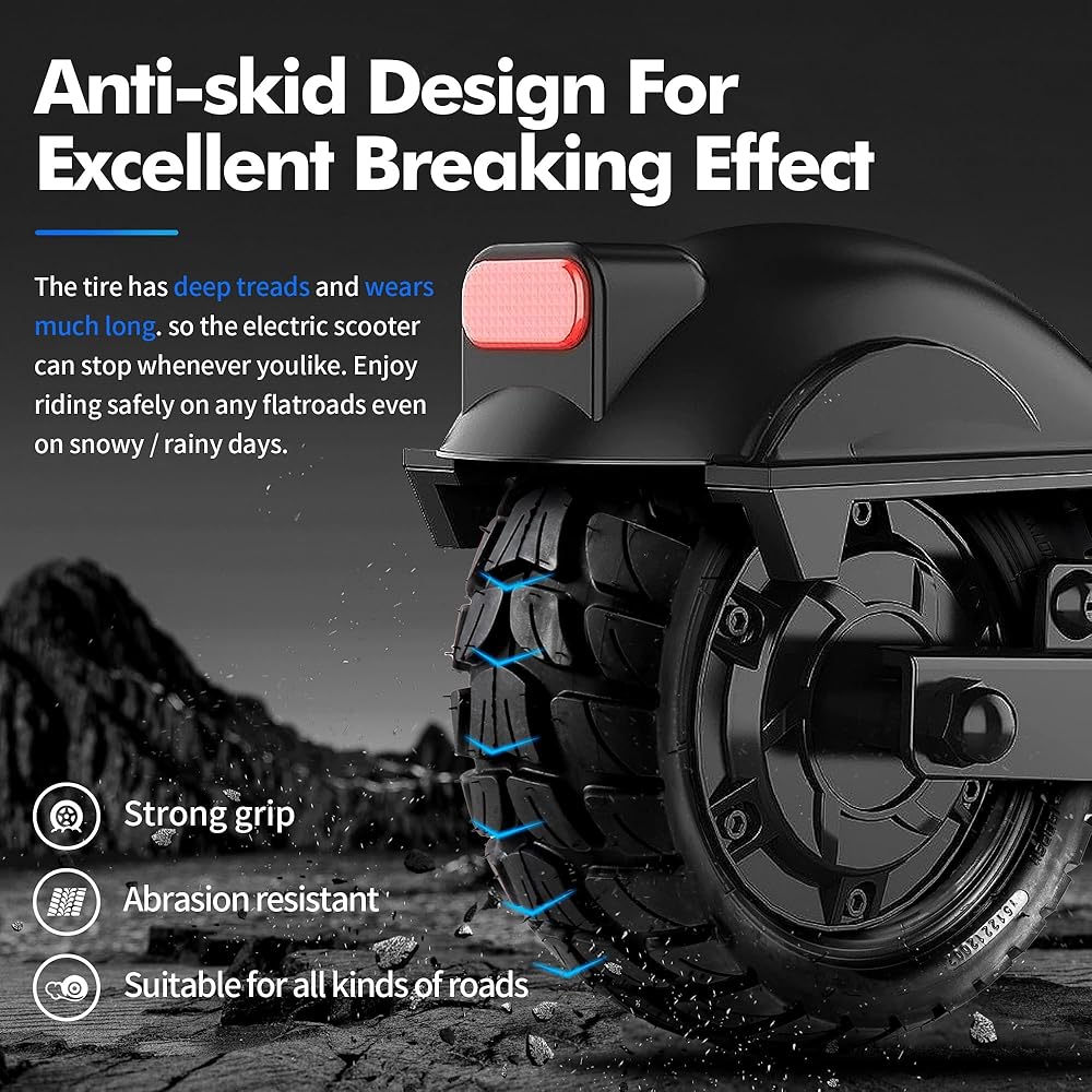• جر متعدد الاستخدامات على الطرق الوعرة: يتميز إطار السكوتر الكهربائي الخاص بنا بنمط مضاد للانزلاق للطرق الوعرة، مما يعد بالجر الأمثل في ظروف الطرق المختلفة. وهذا يضمن قيادة آمنة ومستقرة، مما يسمح لك بالتنقل بثقة عبر المطبات والحصى والأسطح غير المستوية.