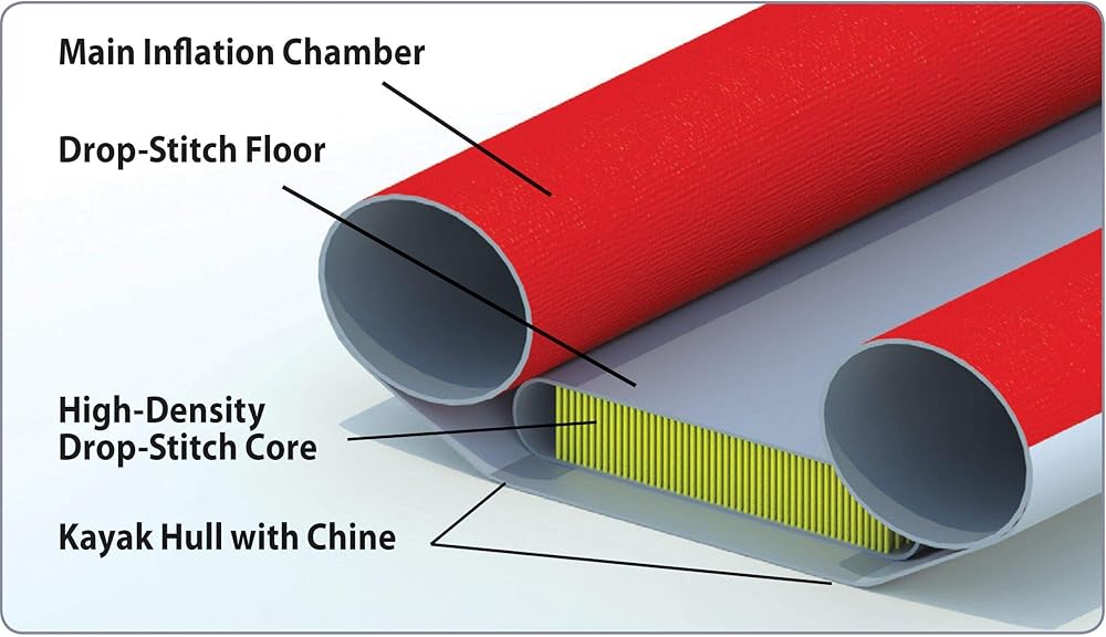Drop-stitch floor - The drop-stitch floor in this kayak creates a hull with chine, which enhances the tracking and hull speed and adds unparalleled rigidity in an inflatable kayak.
