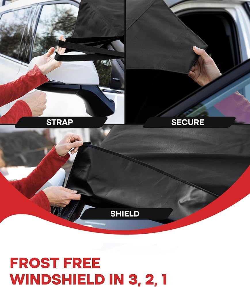 تركيب بدون جهد، آمن وخالي من اللوحات: بالإضافة إلى اللوحات المضادة للسرقة، فإن غطاء الجليد والثلج الخاص بنا للزجاج الأمامي للسيارة مزود بأشرطة للعجلة الأمامية عالية الجودة وأشرطة مرآة جانبية مزدوجة. لن يتم تفجيرها أثناء العواصف الثلجية أو العواصف.