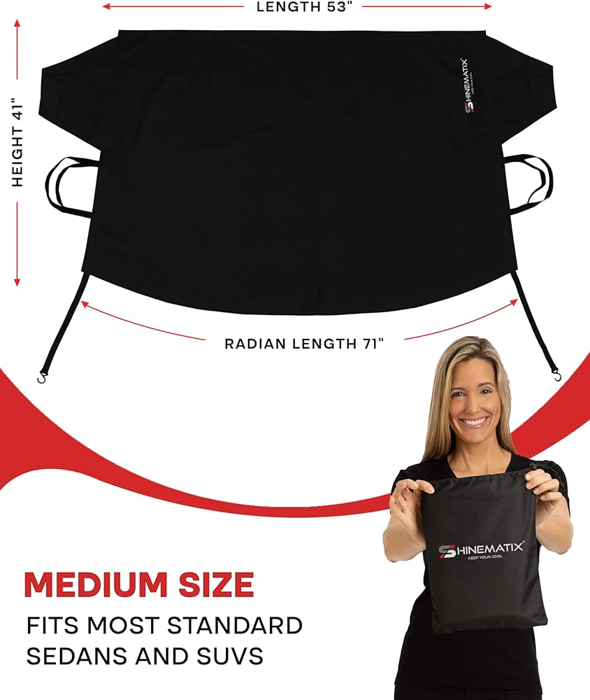 متوفر بمقاسين - غطاء الثلج الشتوي الخاص بنا متوفر بمقاسات قياسية/متوسطة (69 بوصة × 42 بوصة) ومقاسات كبيرة (74 بوصة × 43 بوصة). الحجم المتوسط يناسب تمامًا معظم السيارات القياسية والمدمجة وسيارات الدفع الرباعي والشاحنات الصغيرة، بينما تم تصميم الحجم الكبير للشاحنات الخفيفة والشاحنات الثقيلة الأعرض.