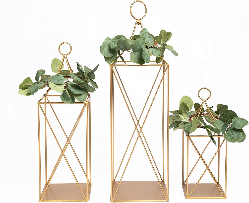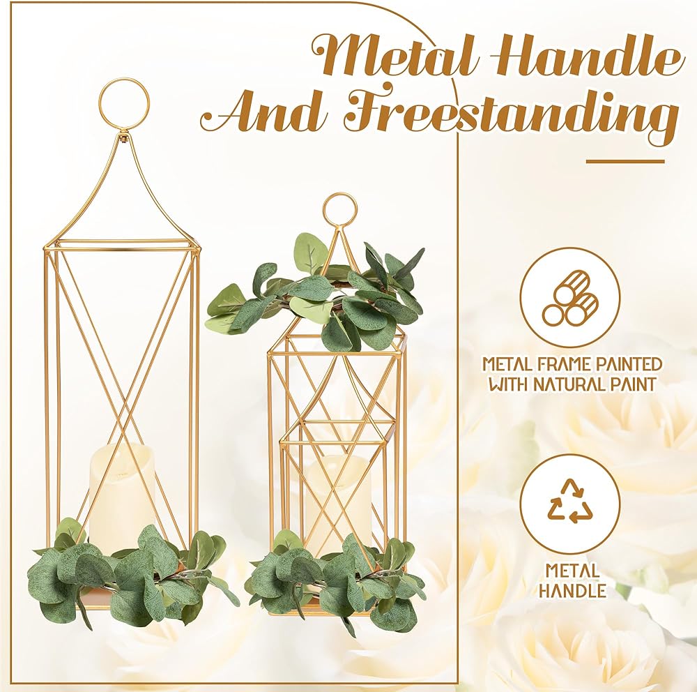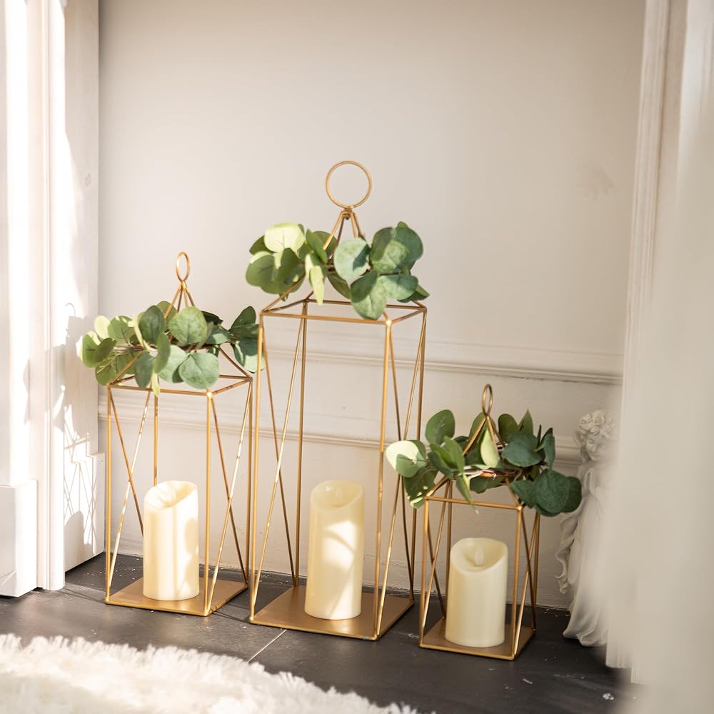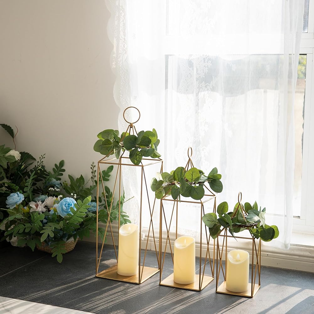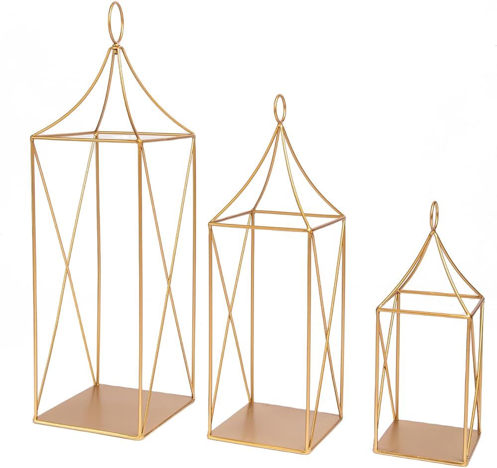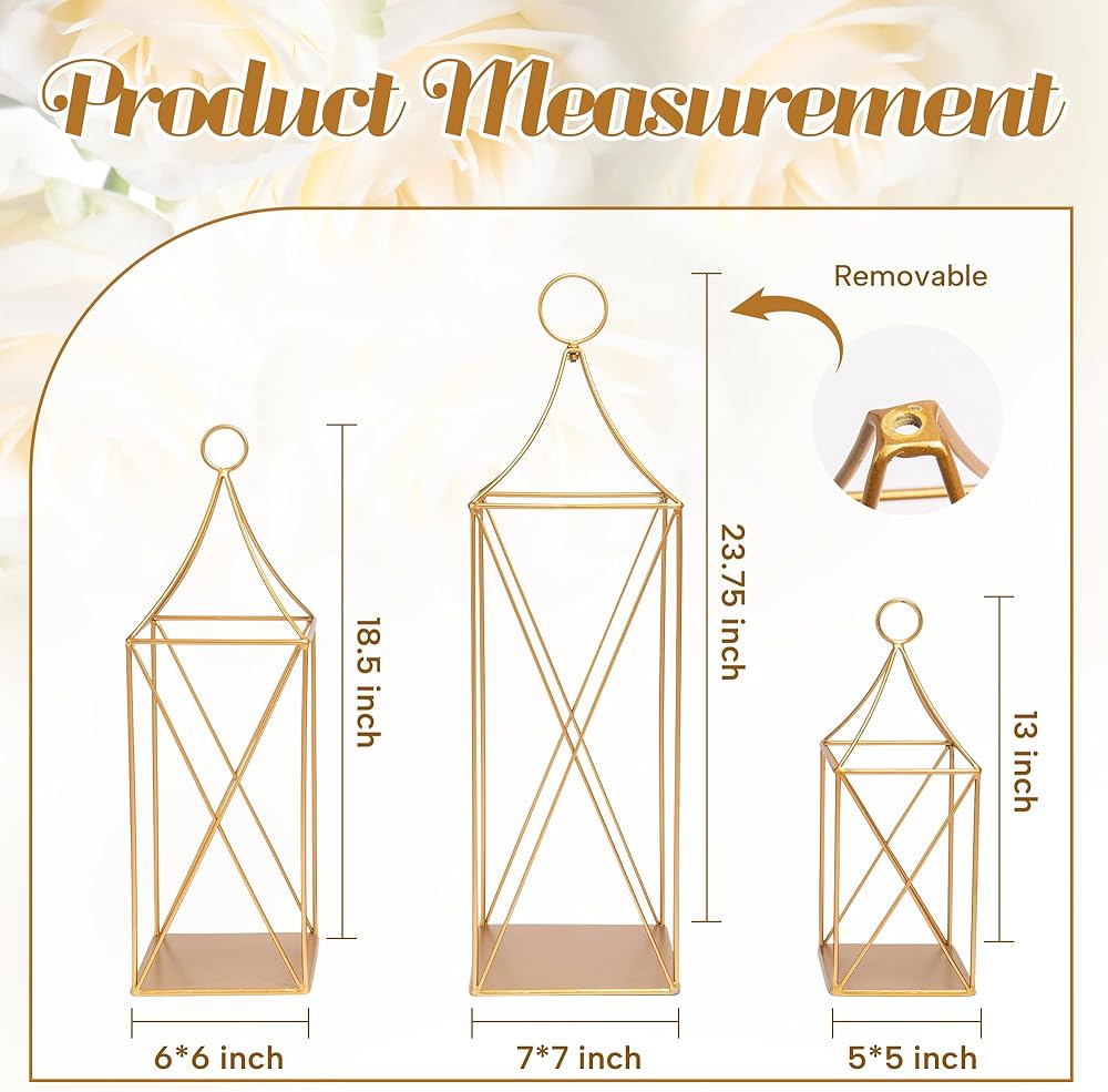 【الأبعاد】: الفانوس المزخرف الخاص بنا مصنوع يدويًا بأناقة من إطار معدني ذهبي قوي. إنها فوانيس رائعة للديكور الداخلي والخارجي. يمكنك تعليقها أو استخدامها كديكور لفانوس الطاولة أو كديكور لفانوس الأرضية. تتضمن مقبضًا قابلاً للإزالة و3 أكاليل. الحجم الأكبر هو 7 بوصة طول × 7 بوصة عرض × 23.75 بوصة ارتفاع، الحجم المتوسط هو 6 بوصة طول × 6 بوصة عرض × 18.5 بوصة ارتفاع، الحجم الأصغر هو 5 بوصة طول × 5 بوصة عرض × 13 بوصة ارتفاع (الشموع غير متضمنة).
