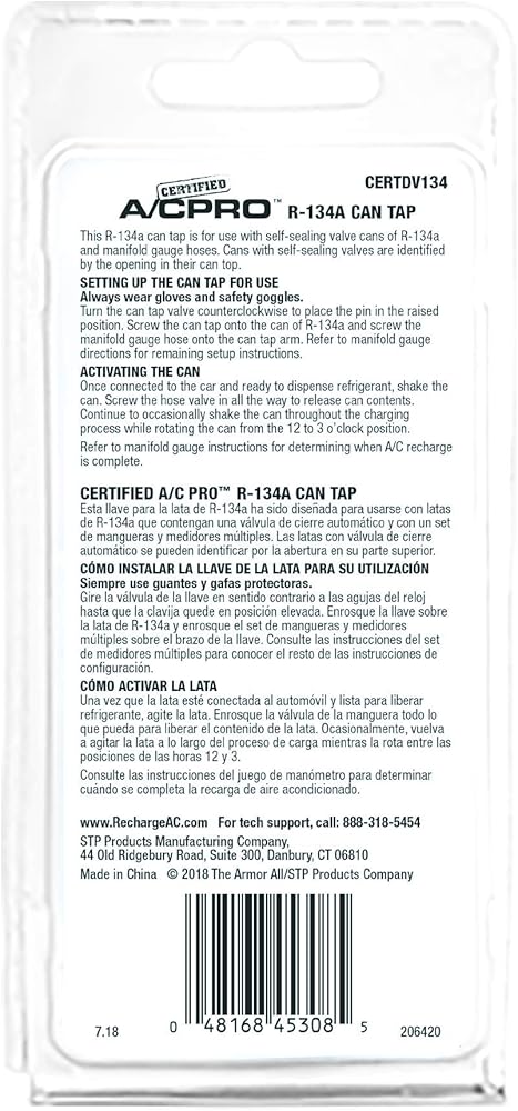 Certified A/C Pro R-134a Can Tap makes it easier than ever for the Dyer to dispense a small can of refrigerant while using a manifold gauge set. This model is designed for EPA compliance. It will only work with R-134a cans with self-sealing valve can tops.
